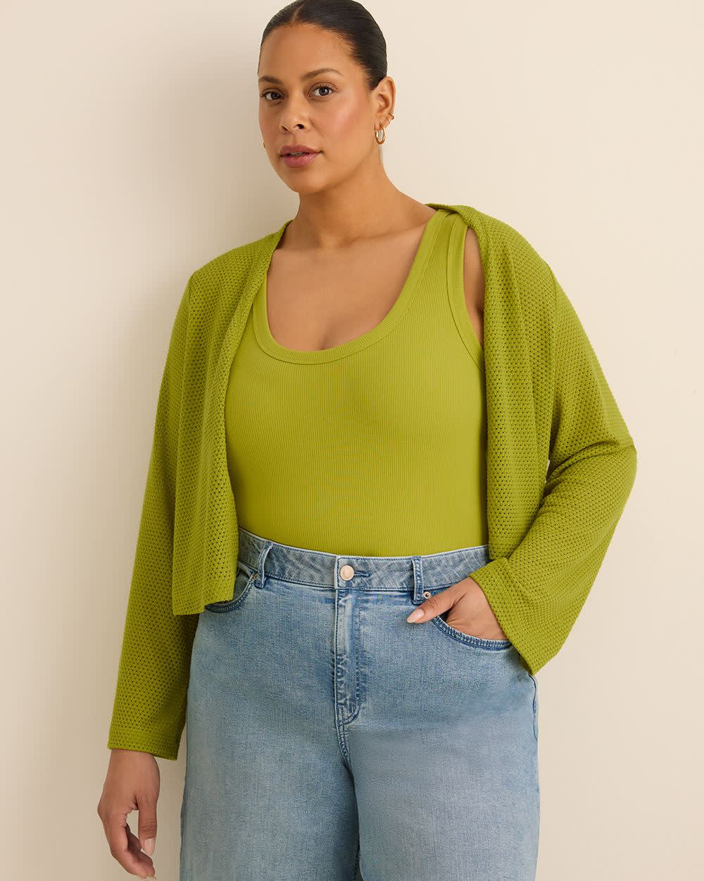 The perfect addition to your year-round wardrobe! Made from a soft and stretchy rib knit fabric, this plus-size cami hugs your curves in all the right places while still providing a comfortable fit. The modern scooped neckline, low back, and sleeveless design make it the perfect top to layer, while the ribbed texture adds a touch of sophistication.