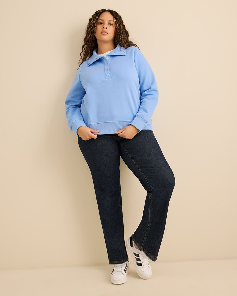 This plus-size sweater is the epitome of comfort. Featuring a mock neckline with snaps and a super soft fleece finish, this straight-fit top will become a favourite you'll want to wear it day after day.