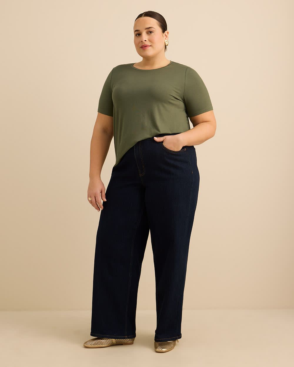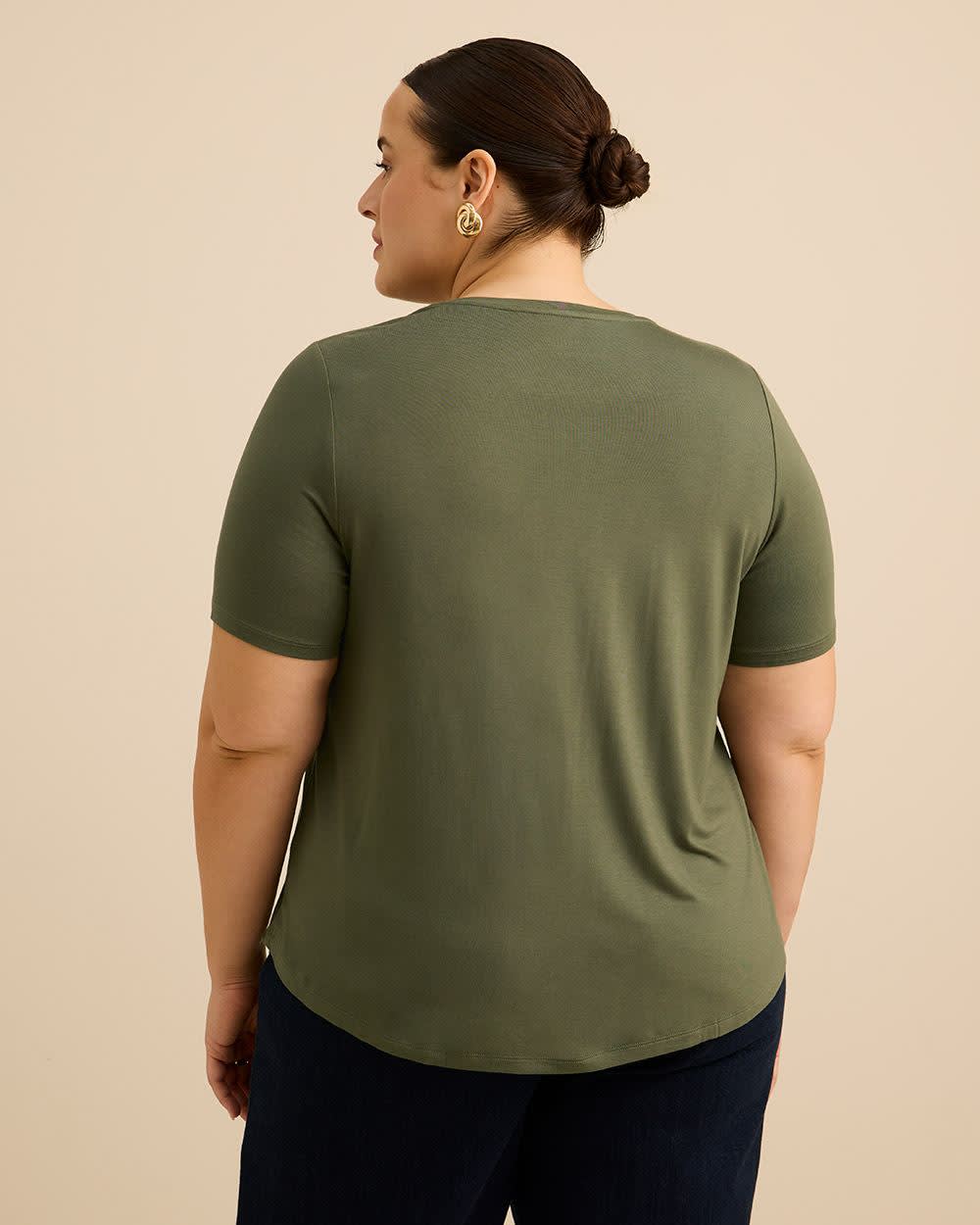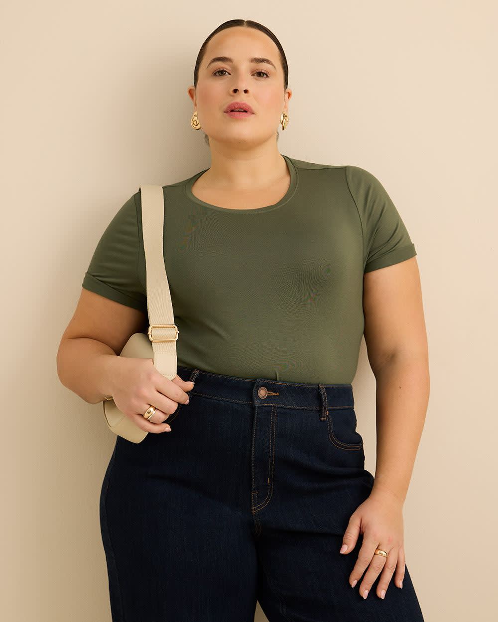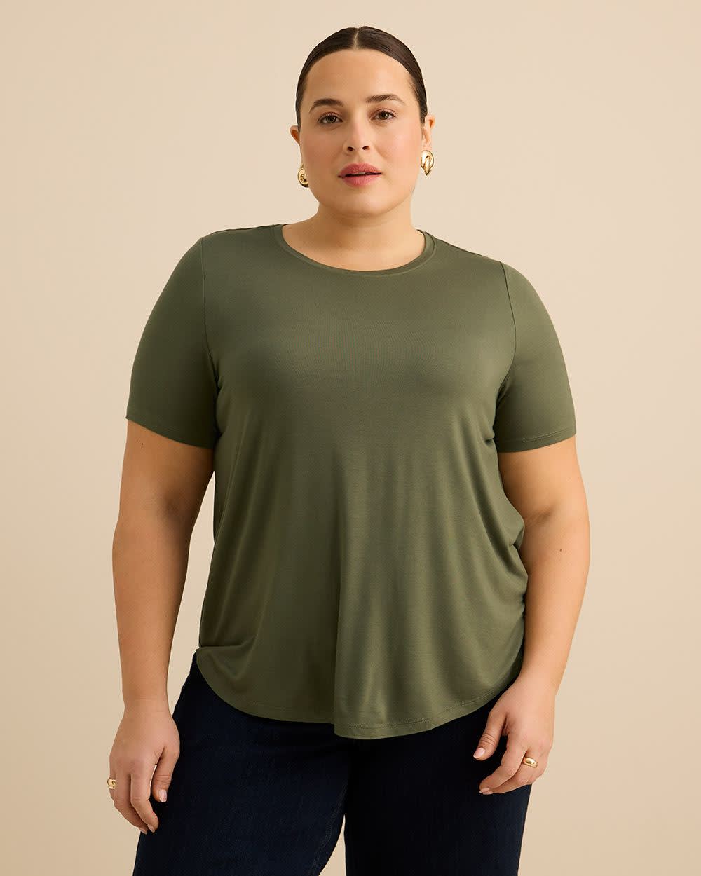 Complete your favourite essentials with this plus-size modern-fit crewneck tee. Soft, stretchy, and elegant, it's the perfect mix of comfort and contemporary style with its short sleeves.