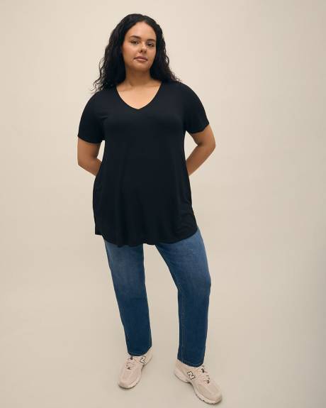 This flattering plus-size modern-fit tunic will quickly become a favourite piece in your wardrobe. With its dark hue and classic V-neck, it will pair wonderfully with your jeans, shorts and leggings thanks to its longer back hem.