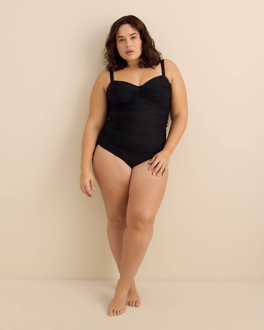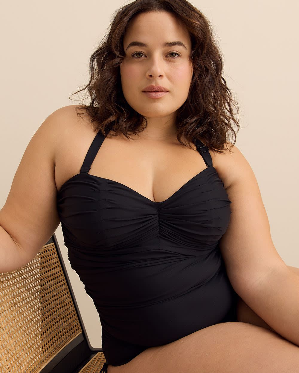 For days spent at the beach or by the pool, this bandeau-style plus-size one-piece swimsuit is an ideal pick. Featuring flattering ruching and adjustable drawcords, this swimsuit can also be worn with the straps as a halter top for added versatility.
