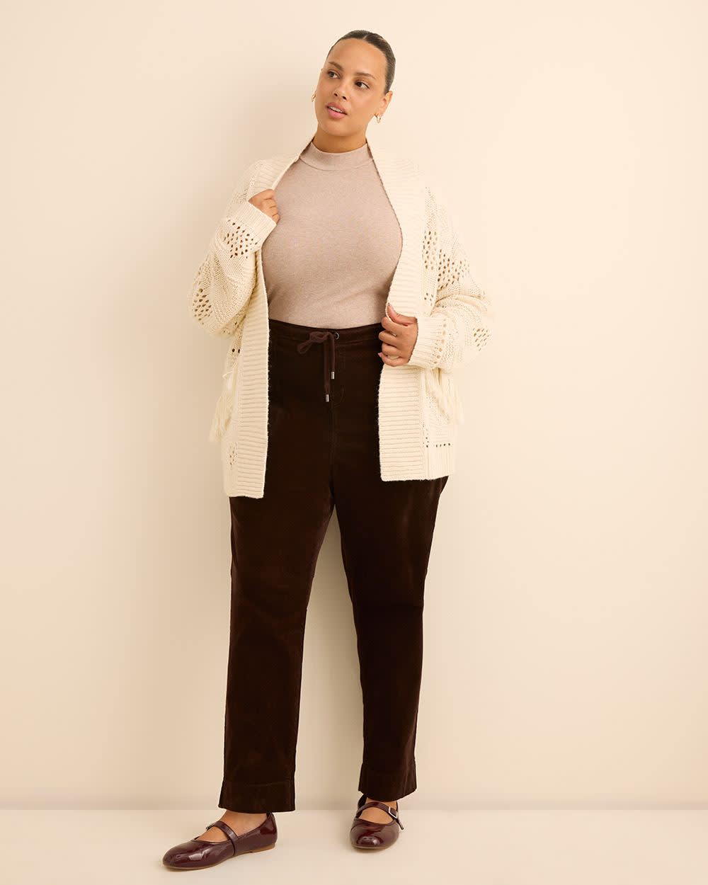 Layer on laid-back charm with this plus-size open tunic cardigan. Finished with tassel details and a relaxed fit, it's the perfect blend of cozy comfort and boho style.