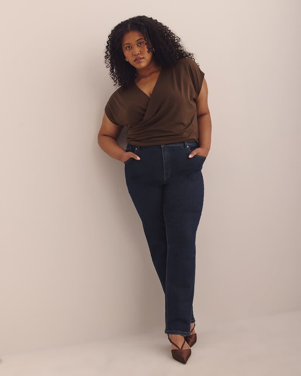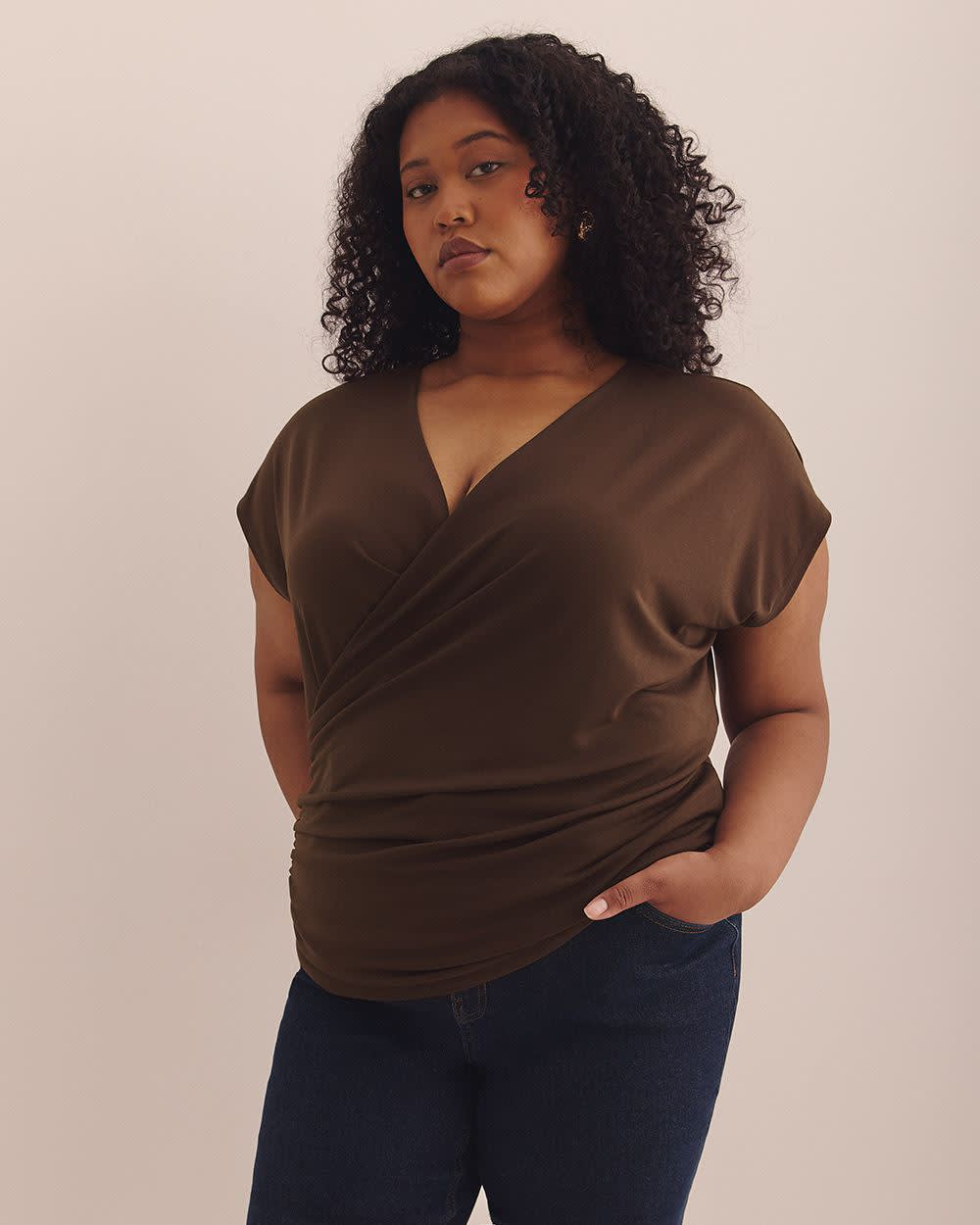 Elegant and feminine, this beautiful plus-size knit top features a faux-wrap neckline that creates a graceful and fluid look. The shirring sides flatter your silhouette to make you feel as good as you look.