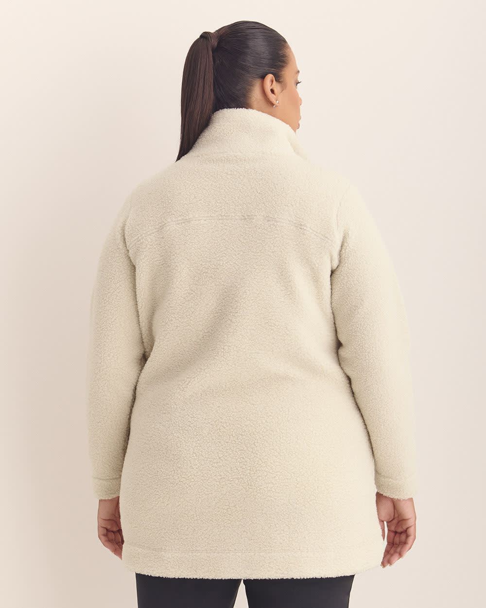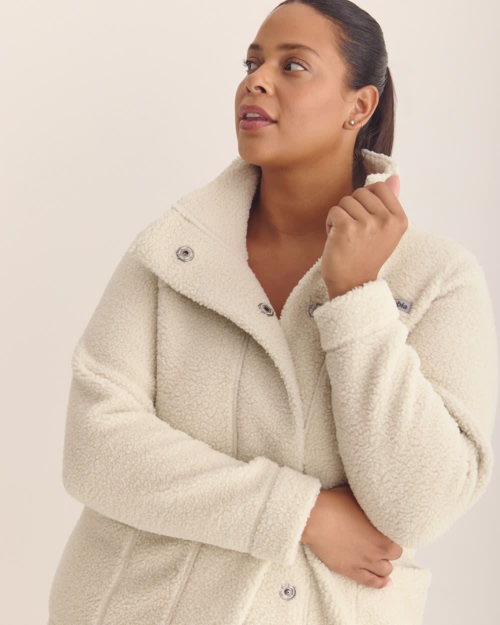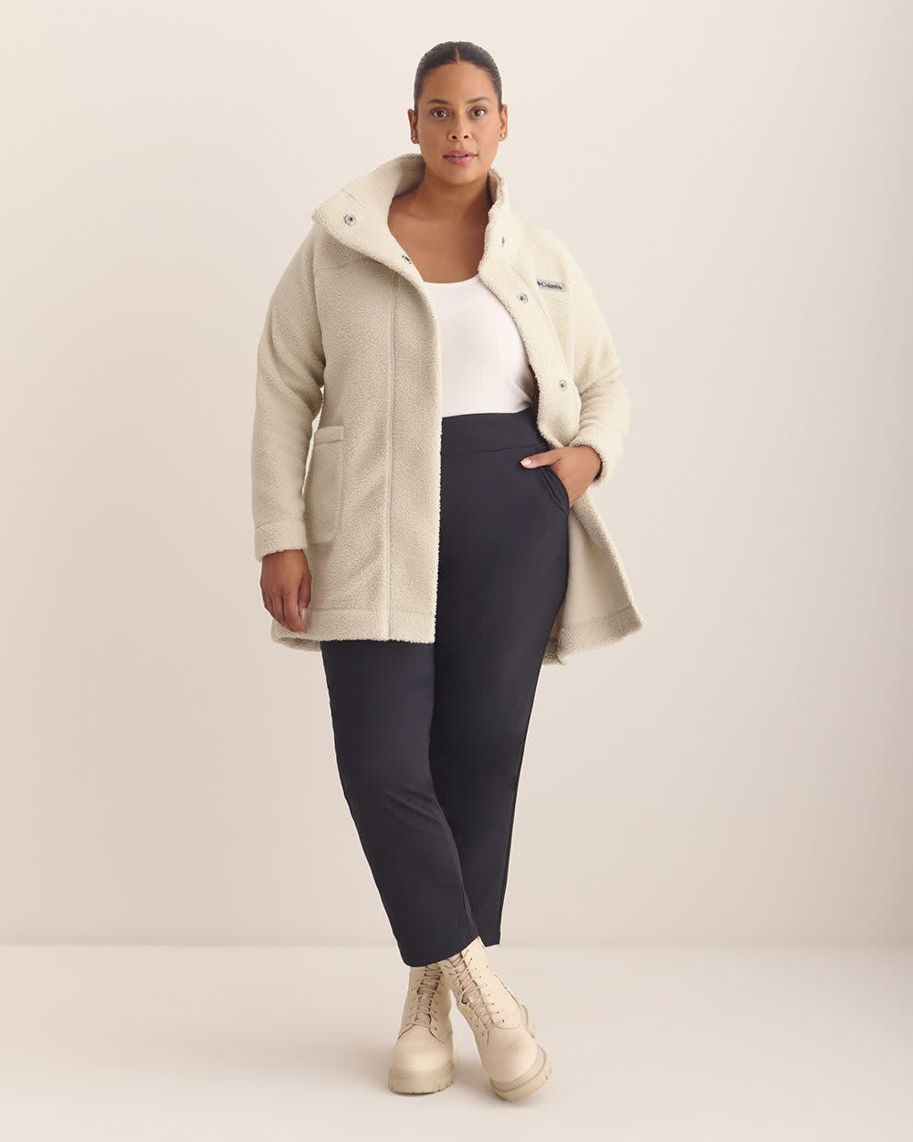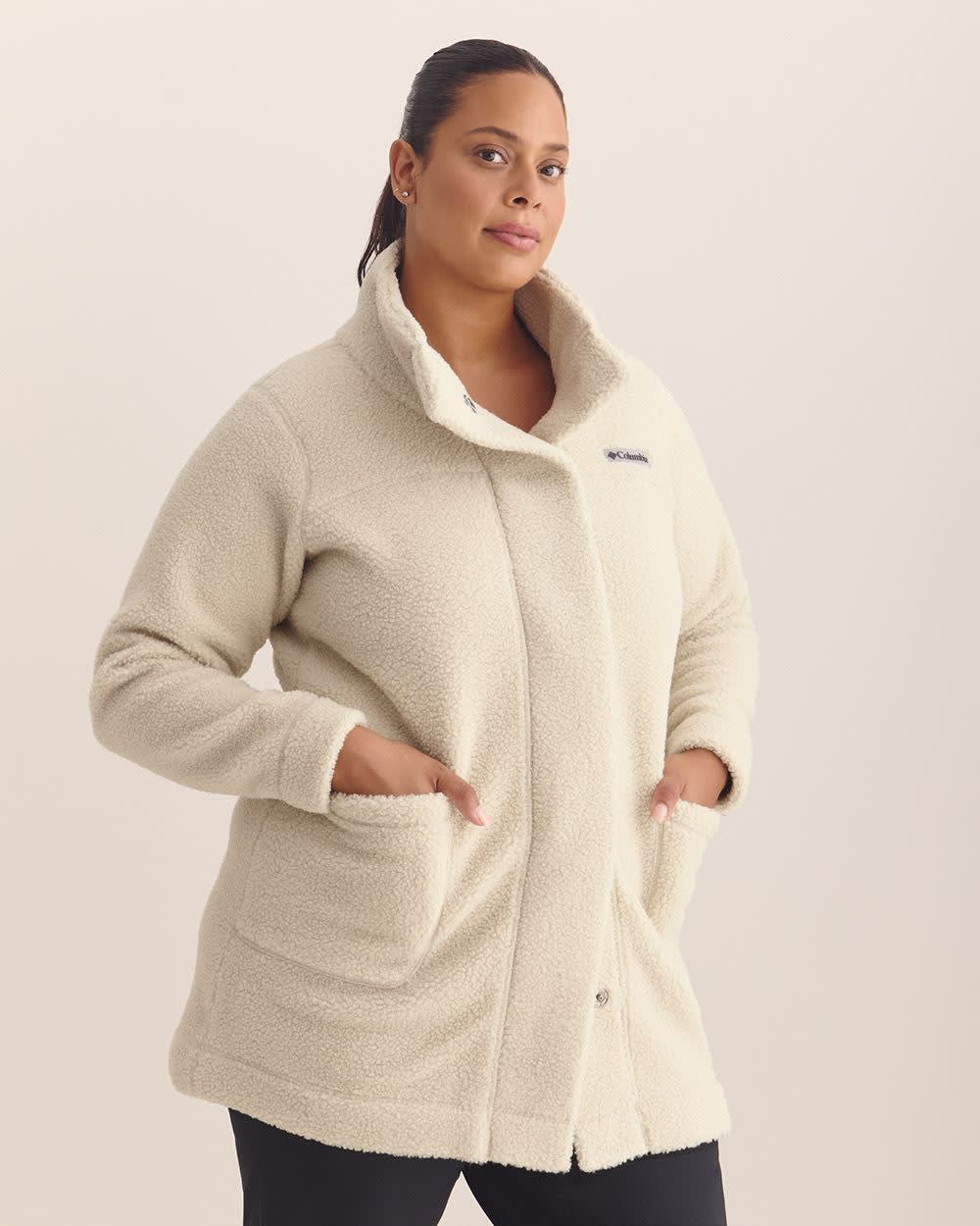 ONLINE EXCLUSIVE. Comfort meets versatility with this plus-size sherpa fleece jacket from Columbia. Crafted with a hidden snap closure, roomy pockets, and a soft, suede-like interior, it's perfect for a cold day in the outdoors. Its long silhouette and thick, nubby fleece creates an extra-warm layer for cold, active days, while the higher collar provides scarf-like protection against chilly winds.