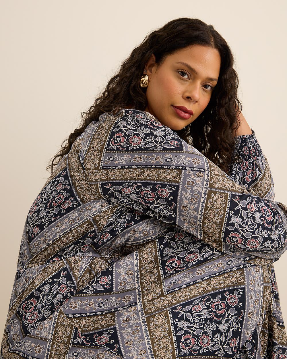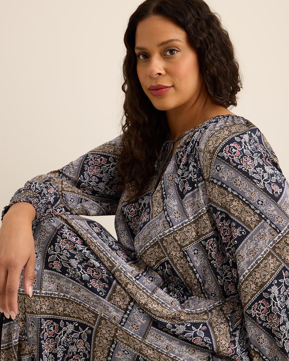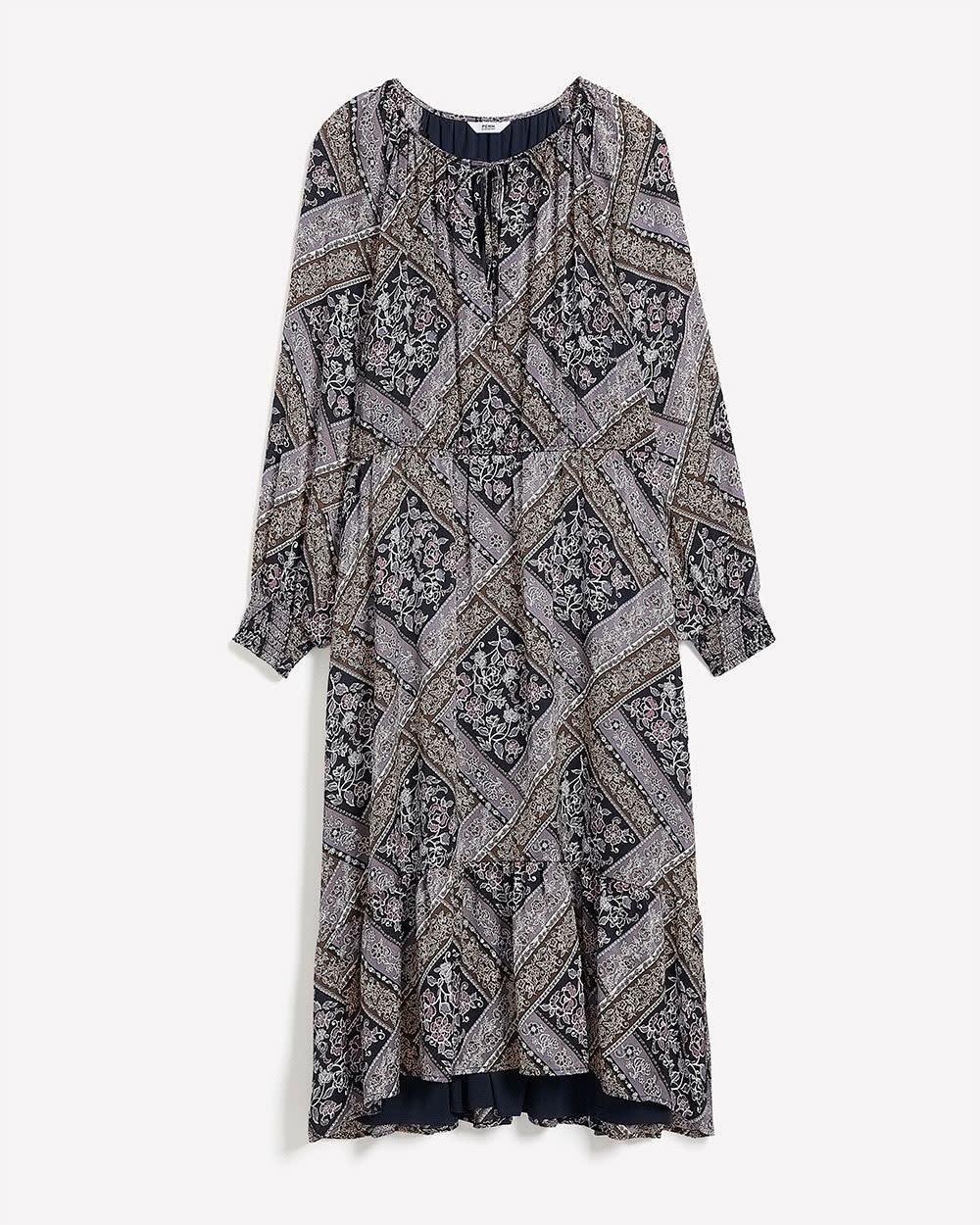 Bring boho charm to your wardrobe with this plus-size patchwork-print midi dress. With balloon sleeves, a tiered skirt, and a breezy fit-and-flare shape, it's effortless style with a playful twist.