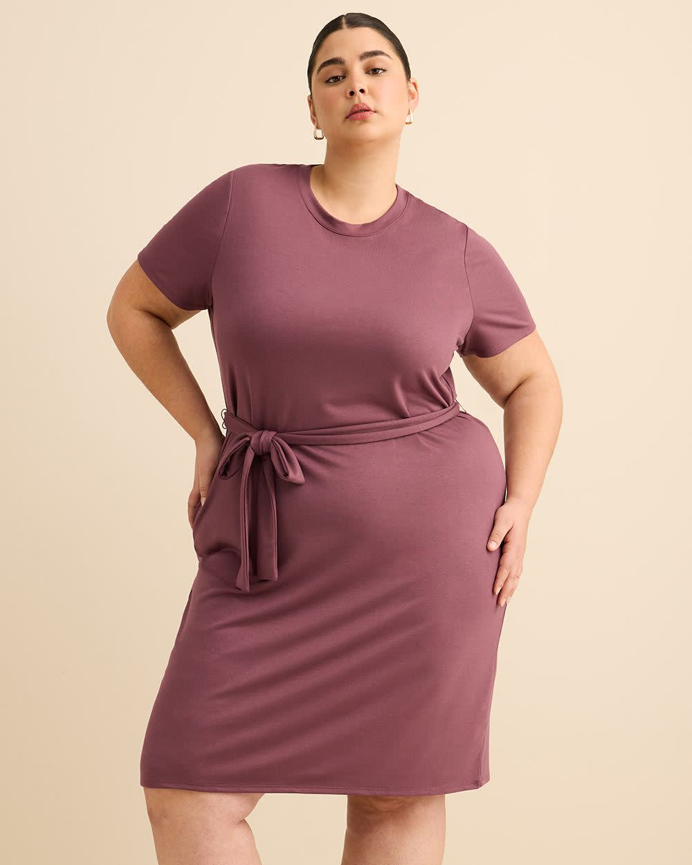 Simple yet sophisticated, this plus-size knit dress is fashioned in a figure-flattering straight fit, with a classic crewneck and soft French terry finish in an elegant plum colour. And its removable belt makes it a versatile choice for any event.