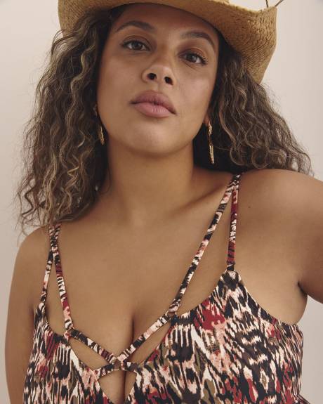 Combining sexy straps while providing coverage and support, this beautiful plus-size one-piece bathing suit is ready for your next vacation. The inner shelf bra and adjustable straps ensure a perfect fit.