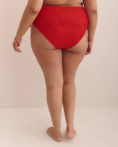 "ONLINE EXCLUSIVE. Everything you love and need to feel fabulous on the beach this summer! This plus-size swim brief from Nana The Brand features a bright red colour, high-waisted design, and stylish drawstrings on each side.