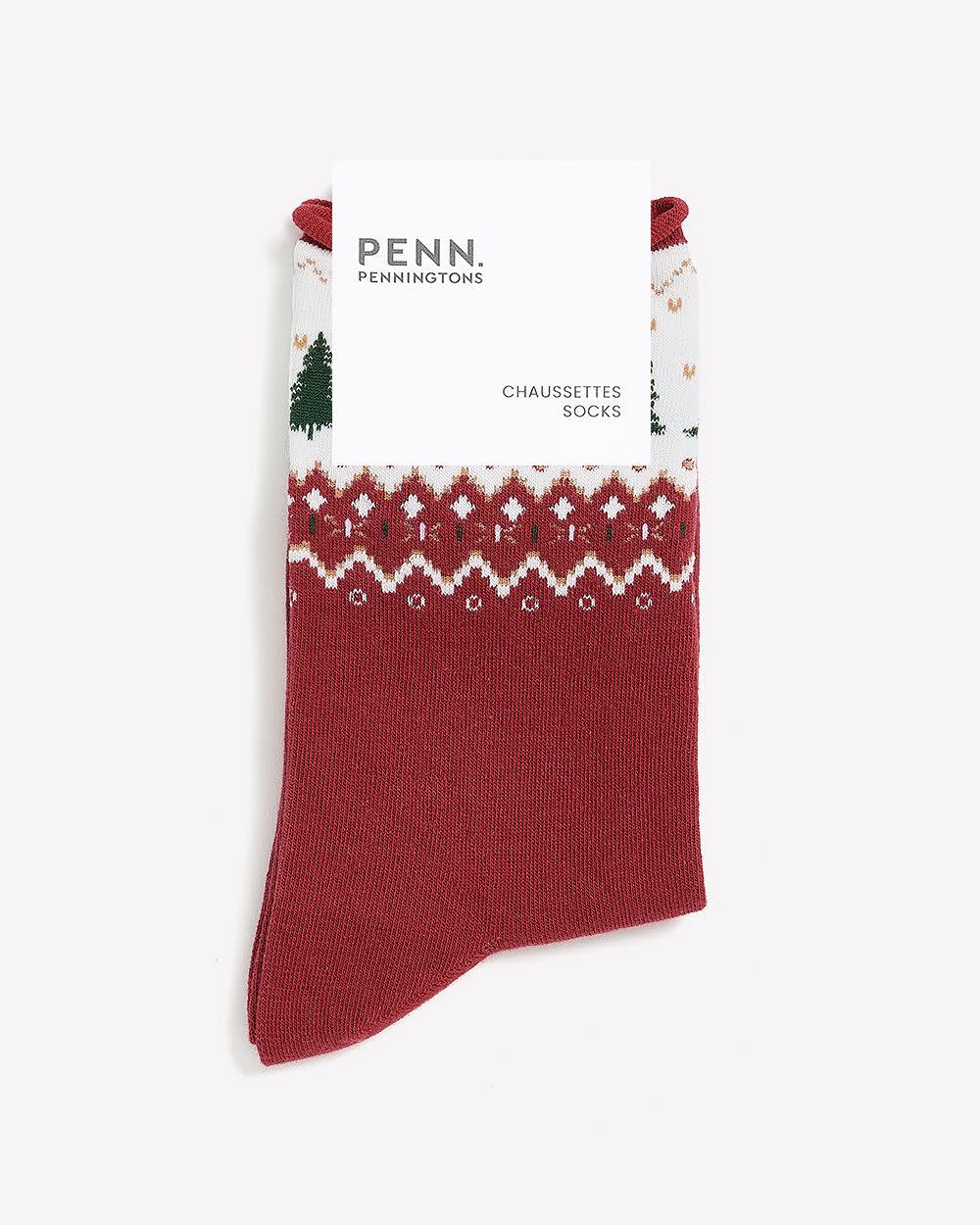 Red Rolled-Edge Crew Socks with Tree Fair Isle Print