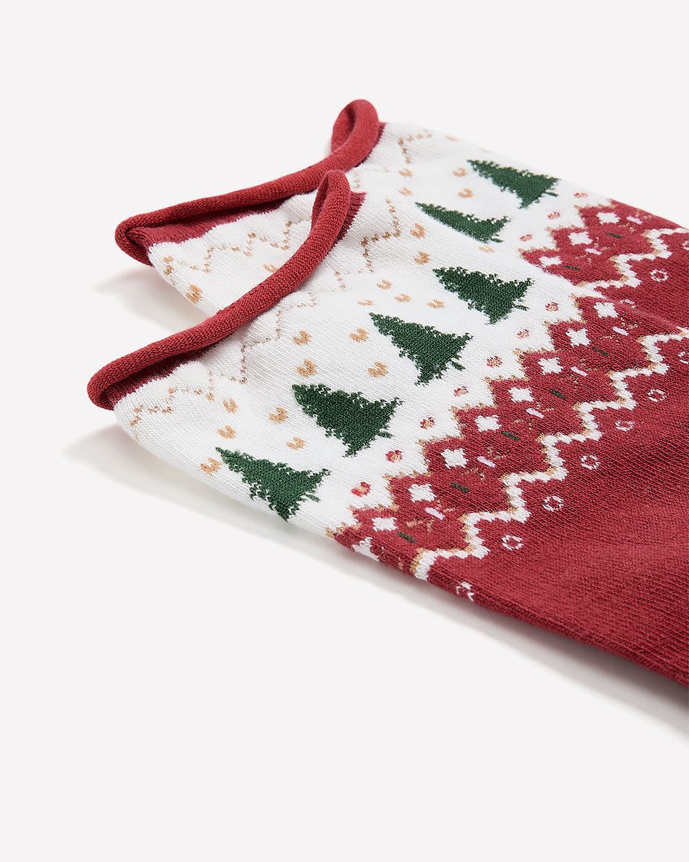 Spread some Holiday warmth with these red crew socks featuring a tree Fair Isle pattern and rolled edges. Soft and snug, they bring a touch of sweetness and style to chilly days.