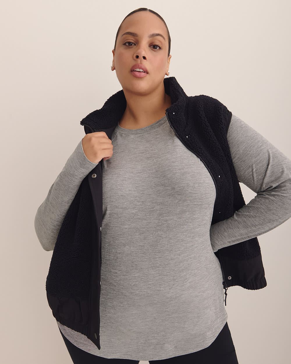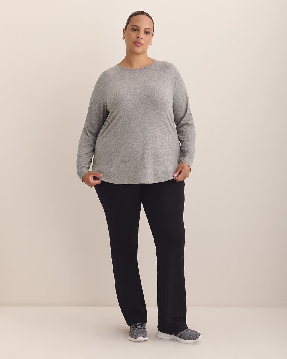 A little comfort to help you get active! This plus-size long-sleeve t-shirt has all the classic features of a sporty top-drylux stretch knit, crewneck, raglan sleeves- with a unique bar tack back.
