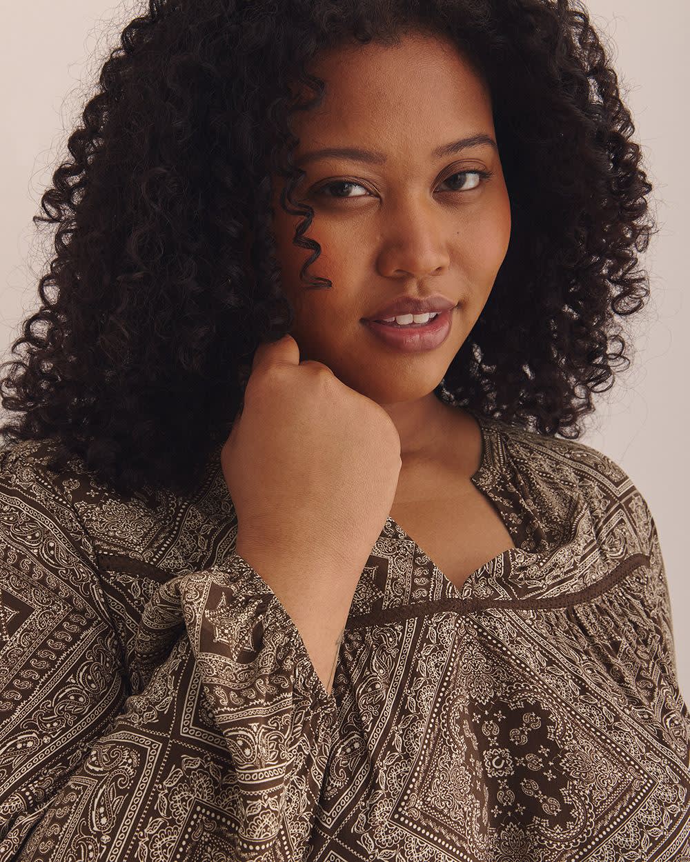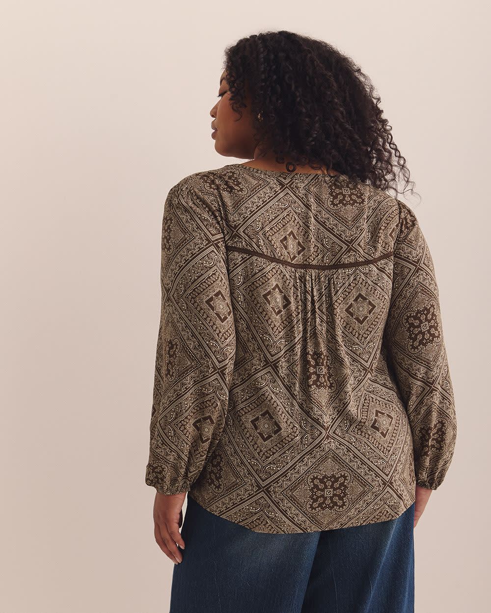 Turn heads in this A-line plus-size blouse with long balloon sleeves. Featuring charming details like a trim at the front and back yoke and shirring under the yoke, it is an exquisite top for a trendy outfit.