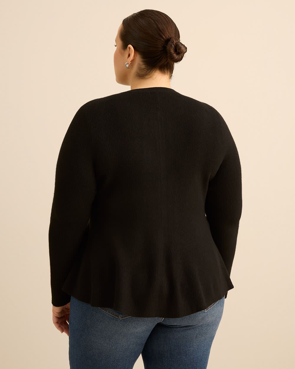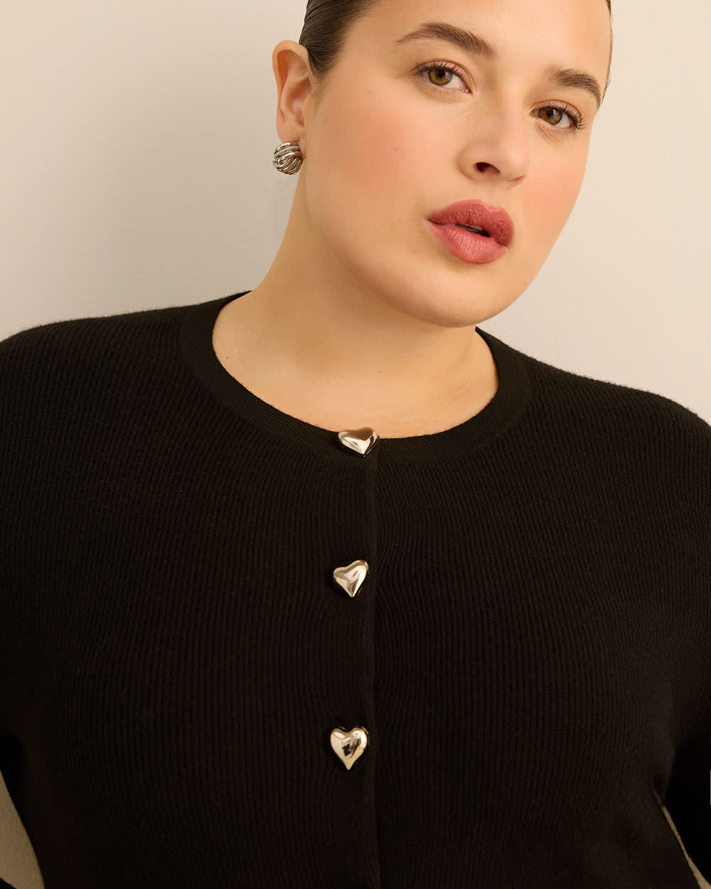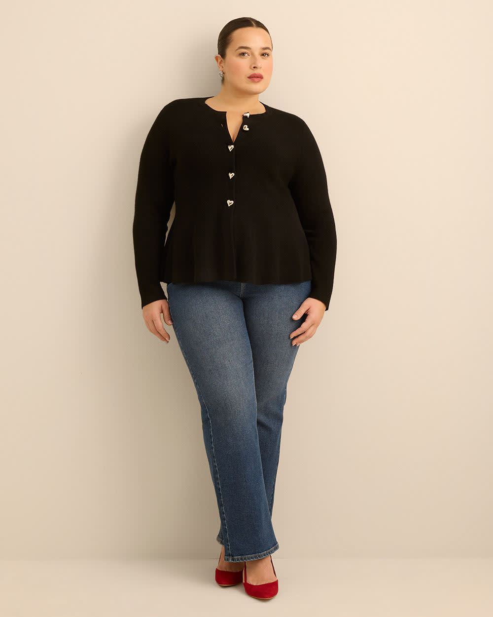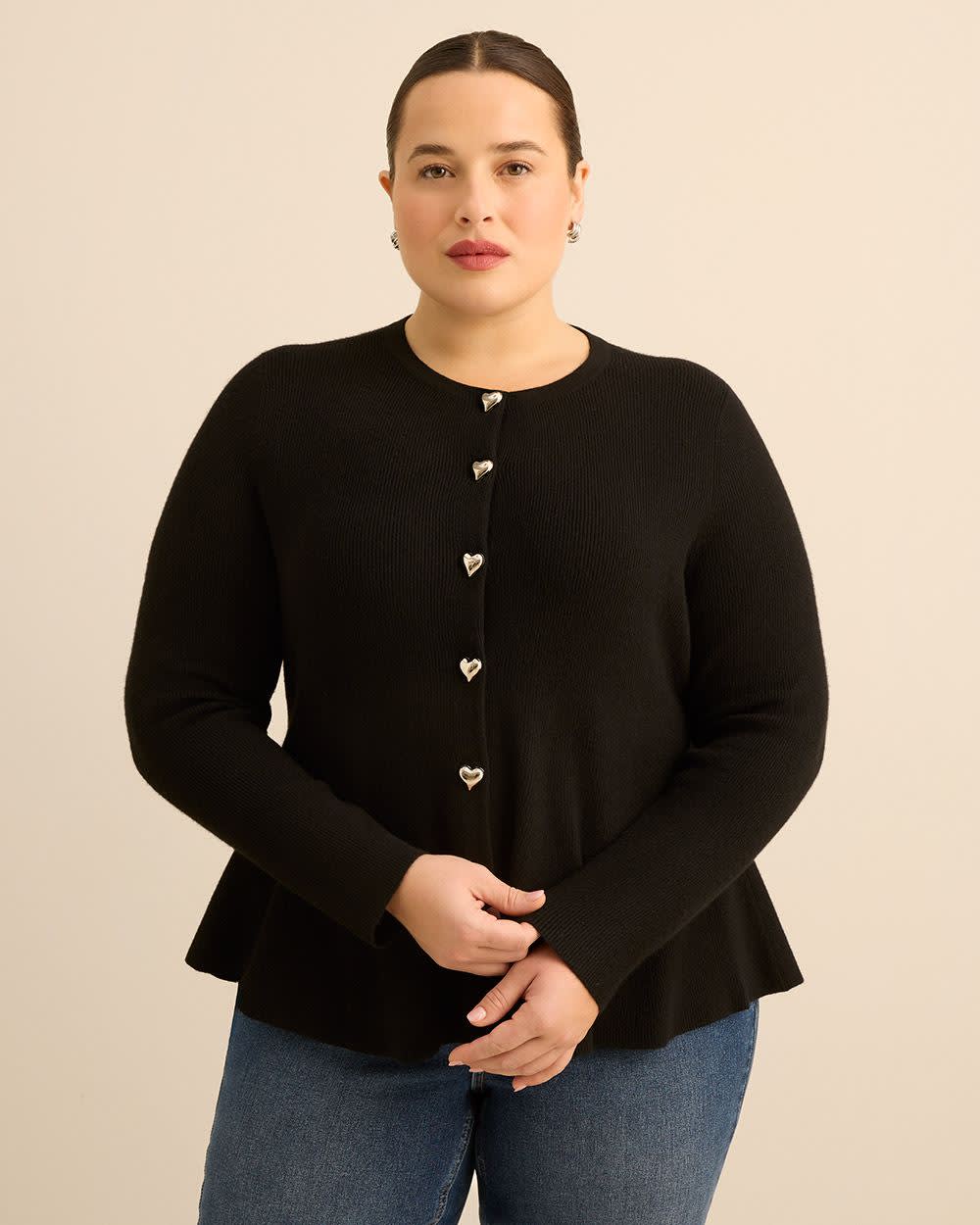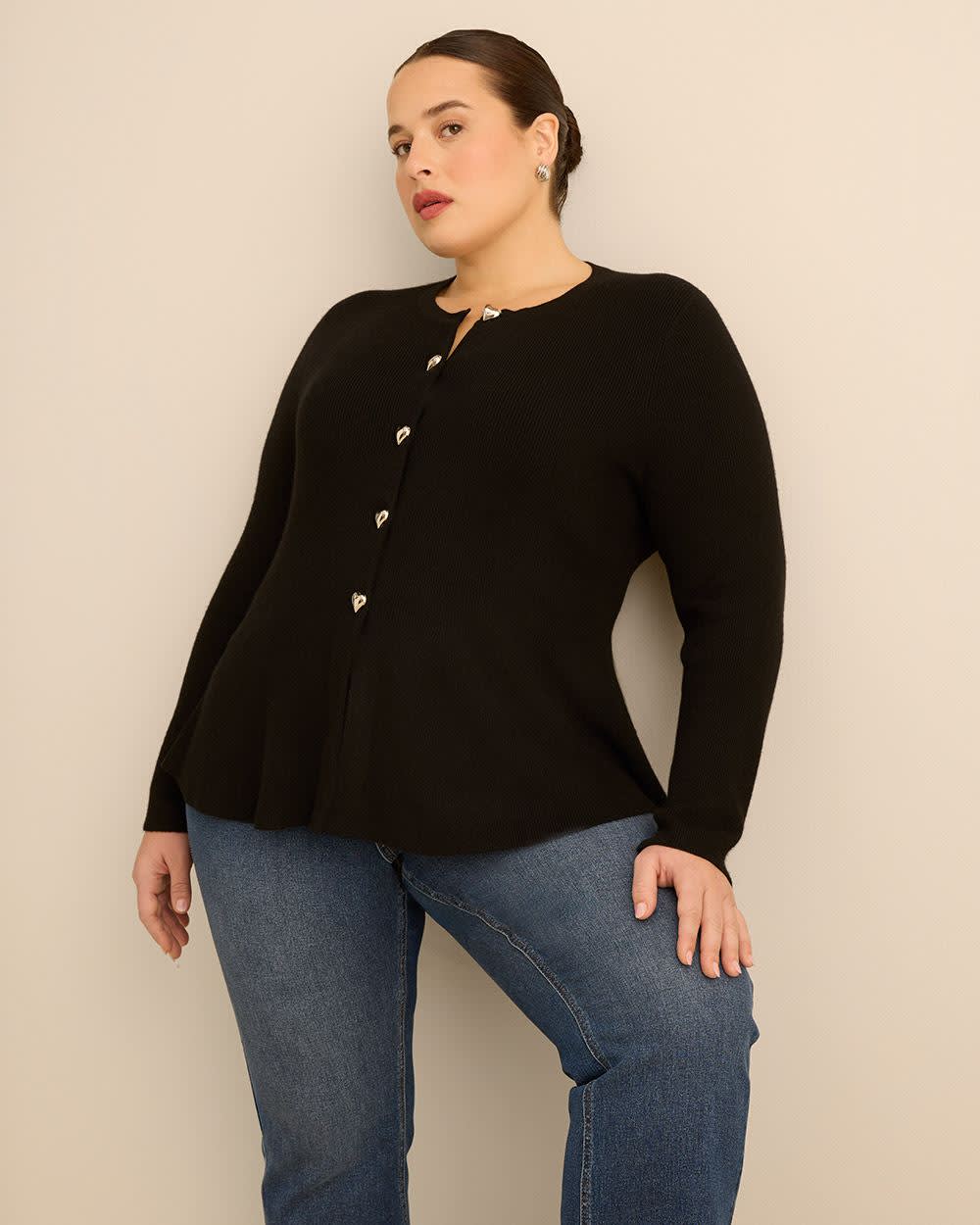 Here's a flattering top to accentuate your hourglass silhouette! This plus-size sweater is the ultimate top to shape your curves in all the right places with a peplum bottom and heart-shaped buttons on the front.
