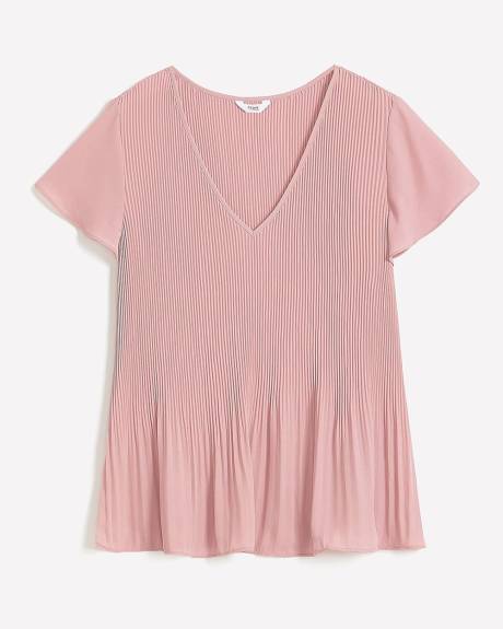 Responsible, Pleated V-Neck Blouse with Short Flutter Sleeves
