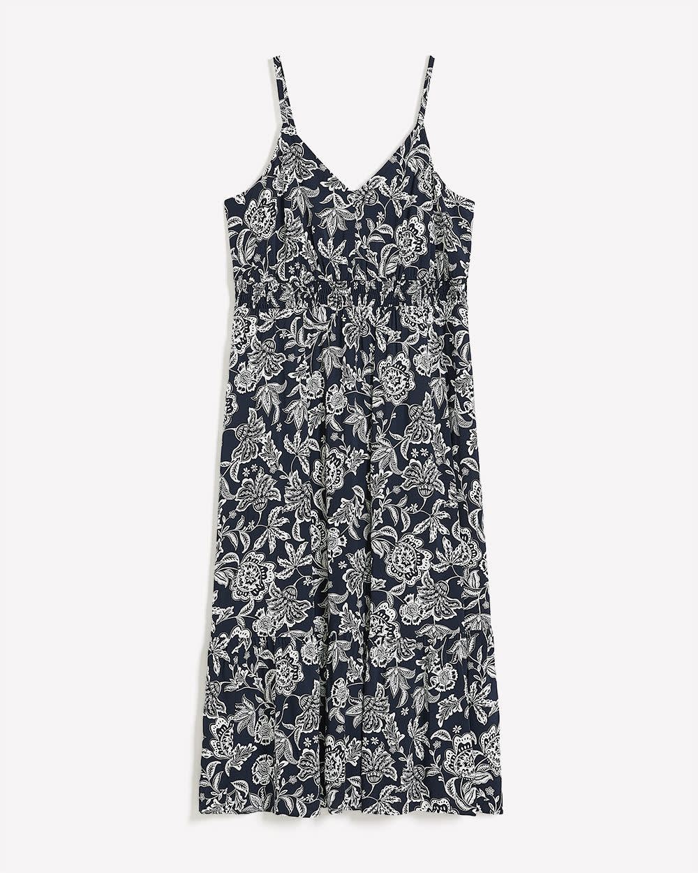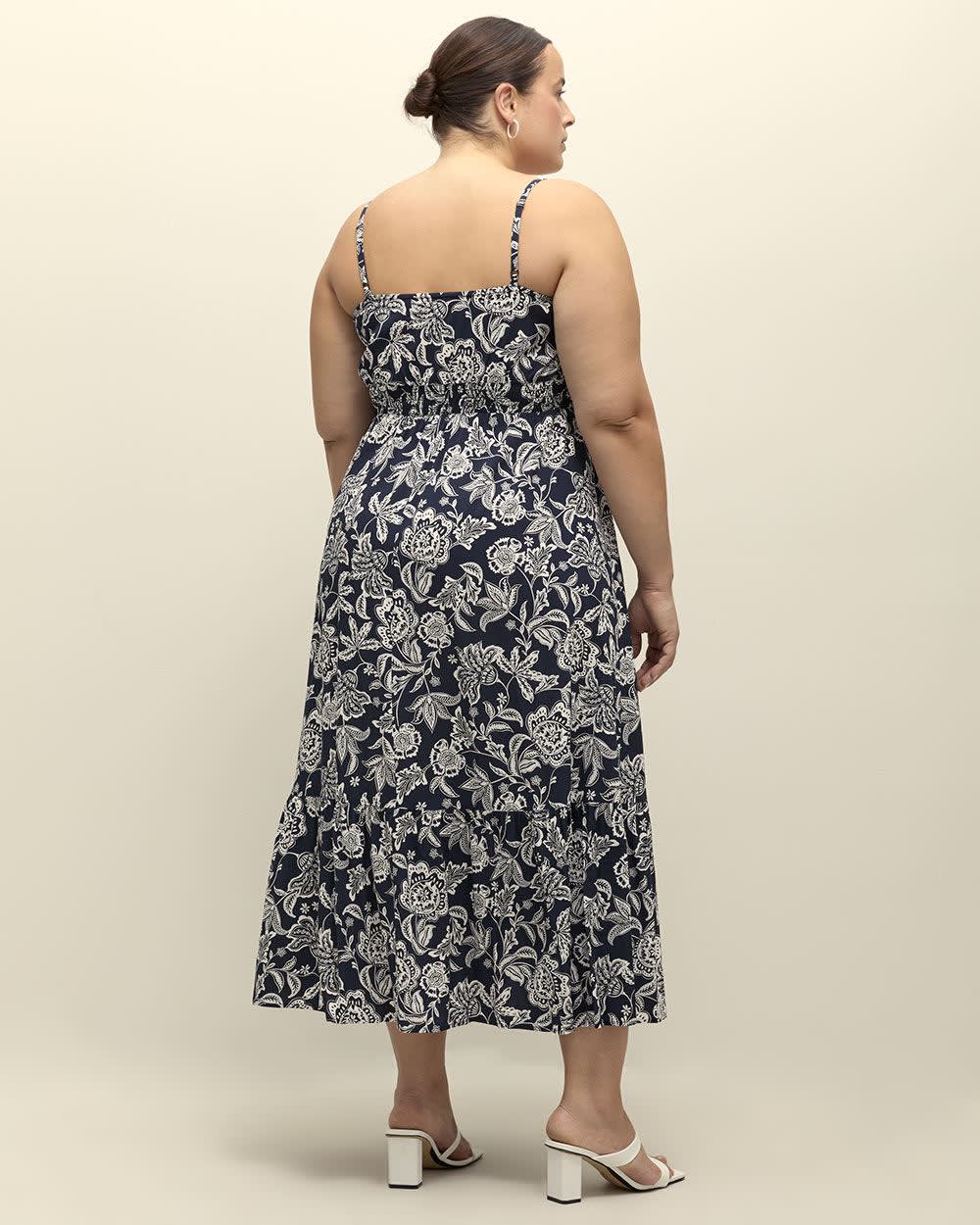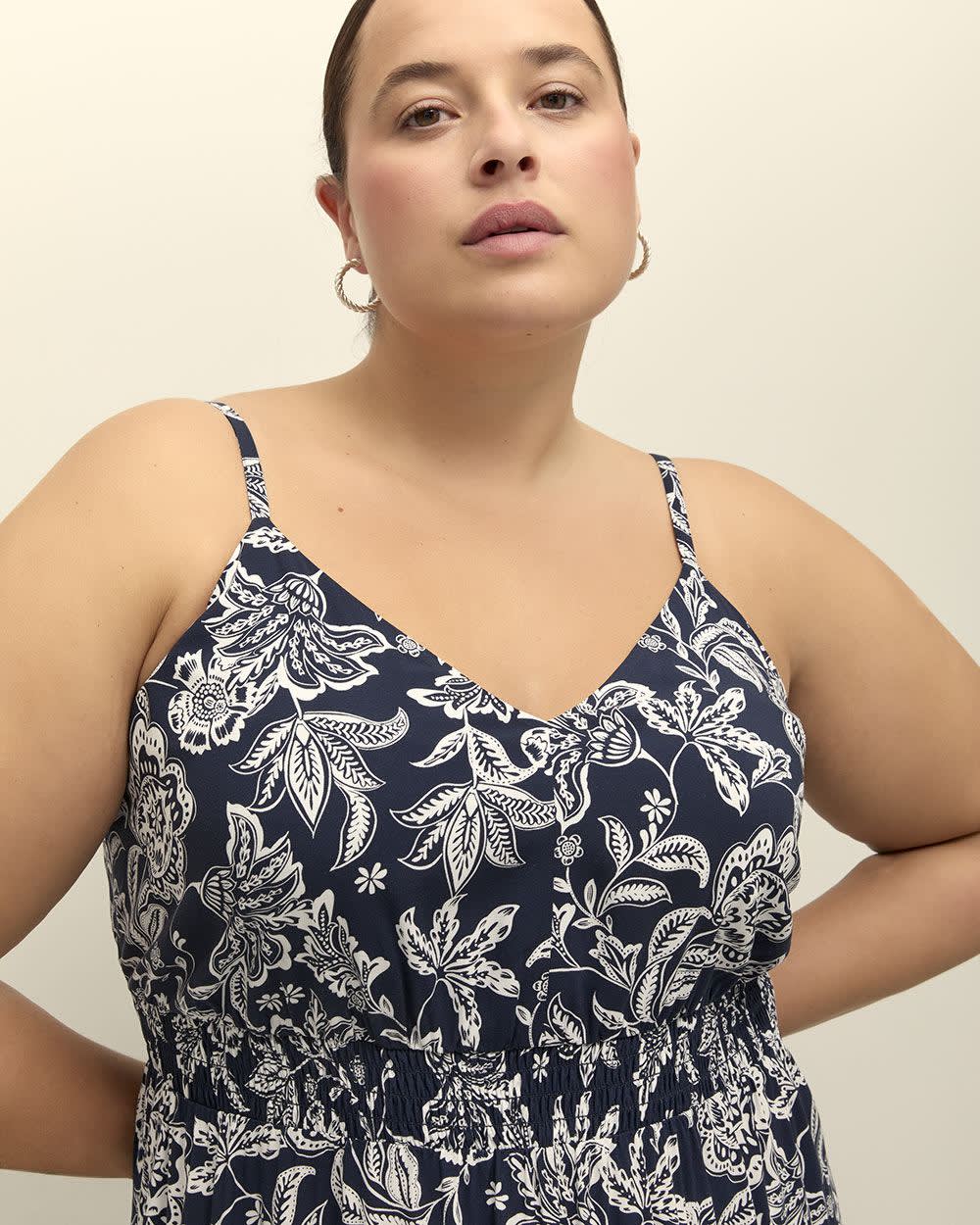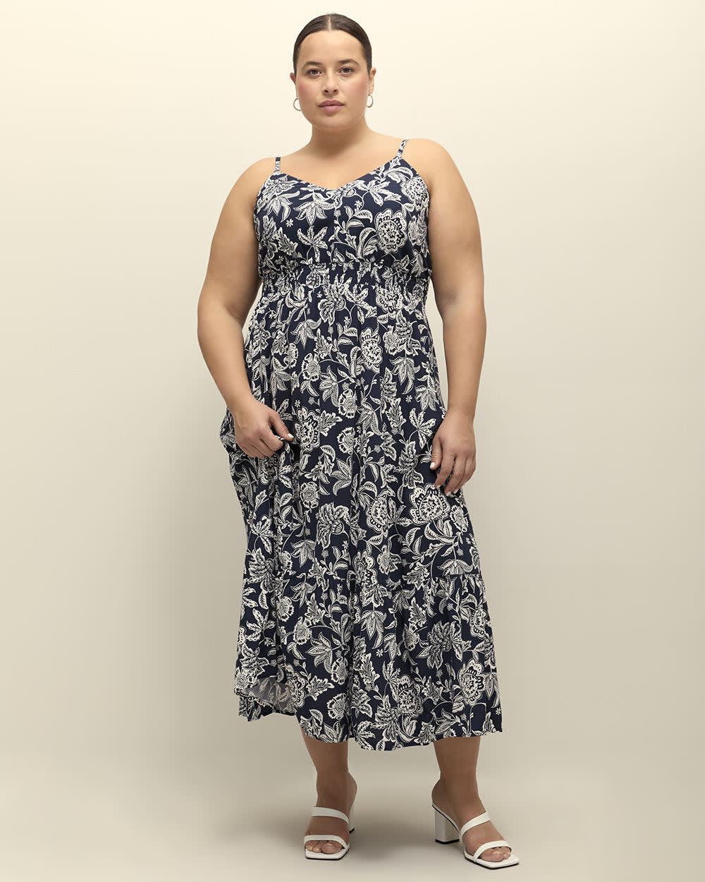 ONLINE EXCLUSIVE. Breeze through warm days in this plus-size printed sleeveless maxi dress, designed in a lightweight woven finish for effortless elegance. Featuring adjustable shoulder straps, a V-neckline, and a smocked waistband, it offers a flattering fit-and-flare silhouette, while the tiered hem adds movement, making it perfect for any occasion.