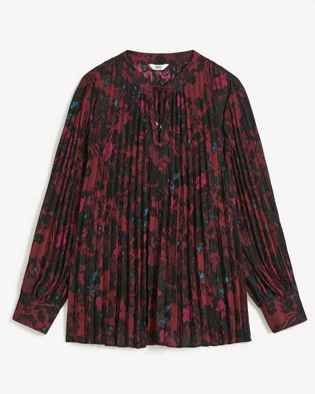 The softness of silky crepe with the playful texture of sun pleats combine in this gorgeous plus-size buttoned down blouse. Both trendy and convenient, this swing-fit blouse is truly unique.