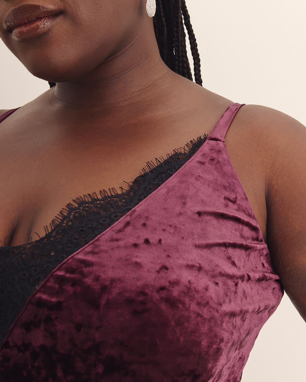Turn heads in this plus-size dark velour midi dress, designed with a sultry lace-trimmed V-neckline. The fit-and-flare silhouette and luxe finish make it a stunning choice for evening glamour.