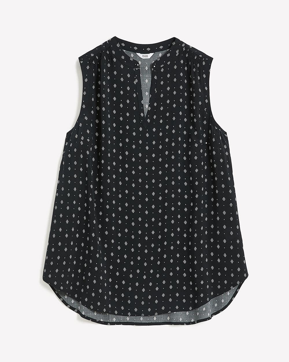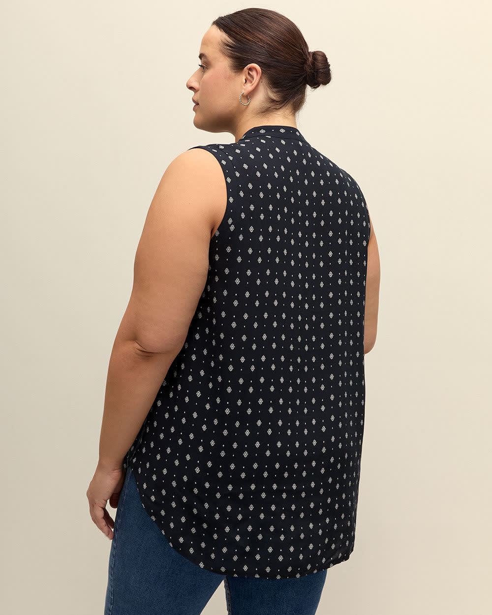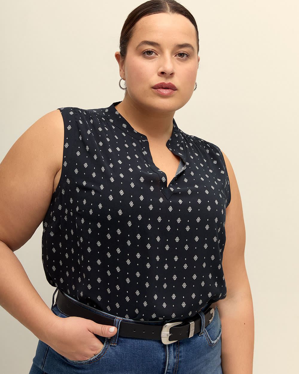 Elegant and versatile. This plus-size sleeveless tunic blouse features a beautiful split neckline with a mandarin collar, and smocked shoulders. Plus, you'll love its flattering straight silhouette.