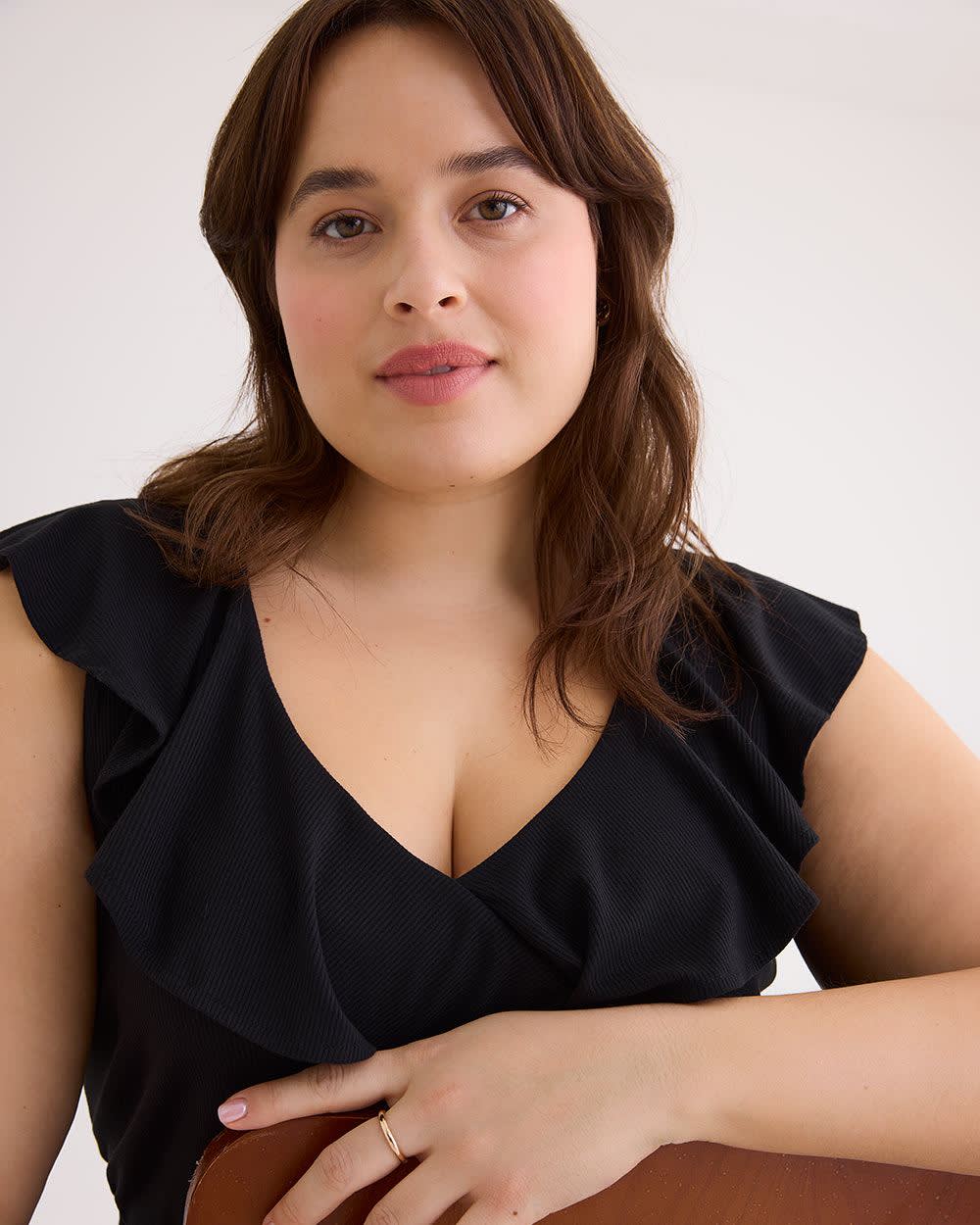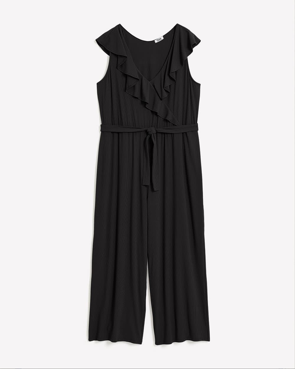 This beautiful plus-size wrap jumpsuit is the perfect piece for going out in style this summer. The ruffled neckline, ribbed knit fabric, wrap silhouette, wide-leg and sash belt add visually pleasing elements to this beautiful garment. Just add your favourite heels and you are ready to dance the night away.