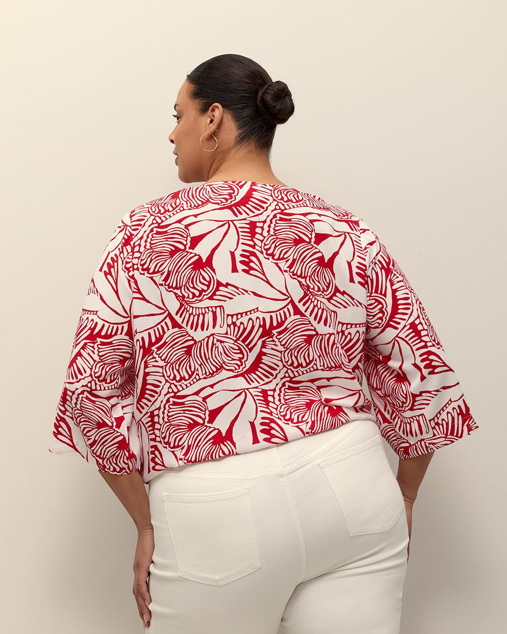 The perfect top to dress-up your high-waisted jeans! This plus-size 3/4 sleeve top is adorned with a trendy knot detail at the front for a beautiful twist.