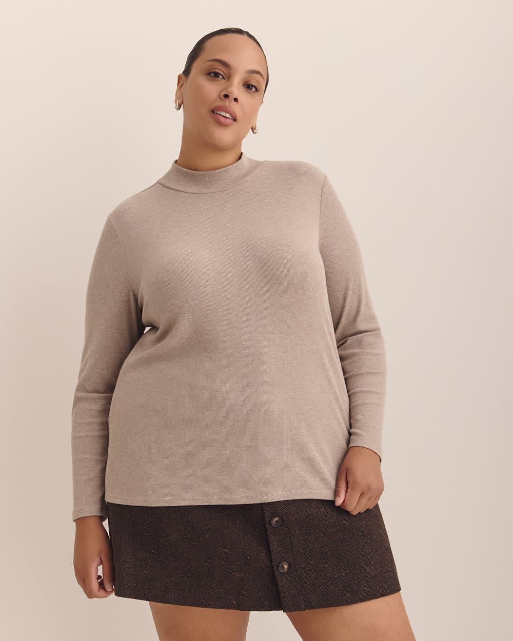 For a modern yet classic top, try this plus-size long-sleeve fitted top! Boasting a trendy ribbed knit finish for a touch of texture and an elegant mock neckline, this modern-looking tee will provide you with a cozy everyday style. Perfect for layering with a blazer or cardigan.