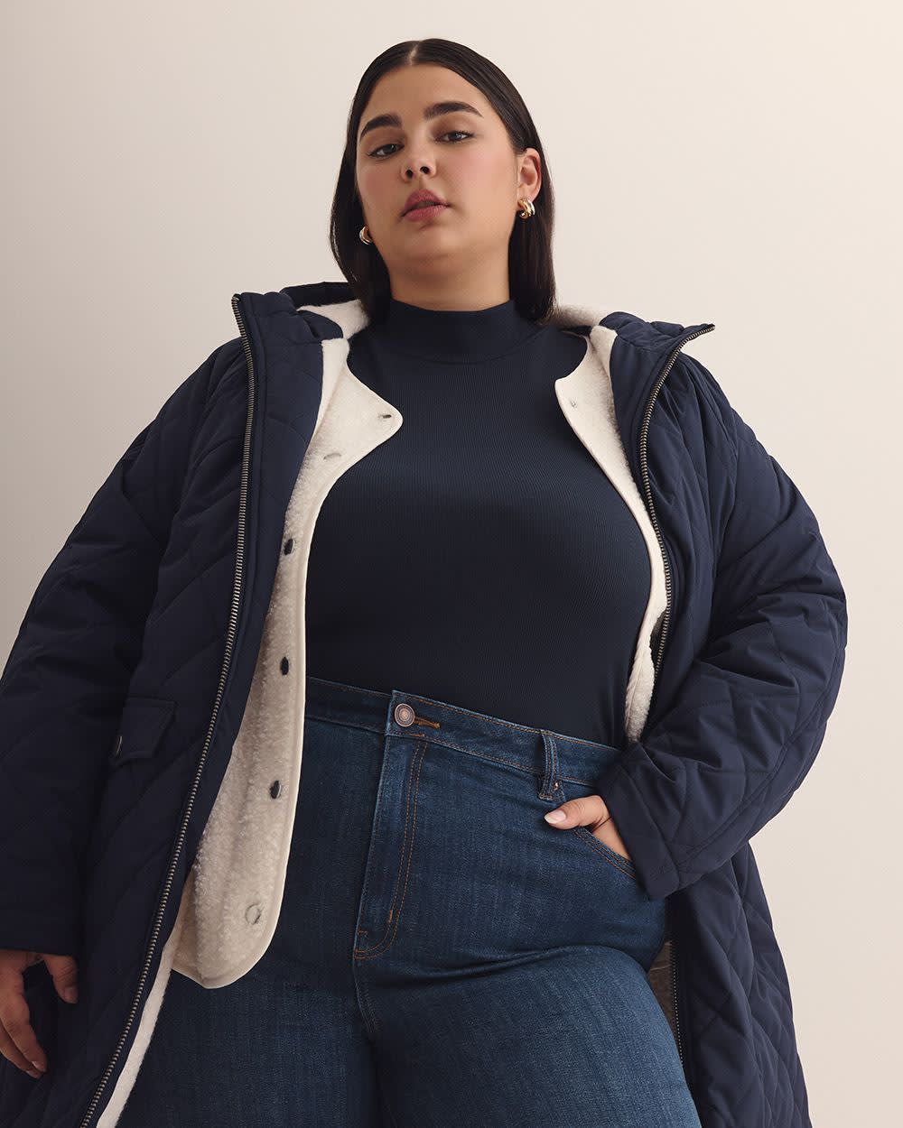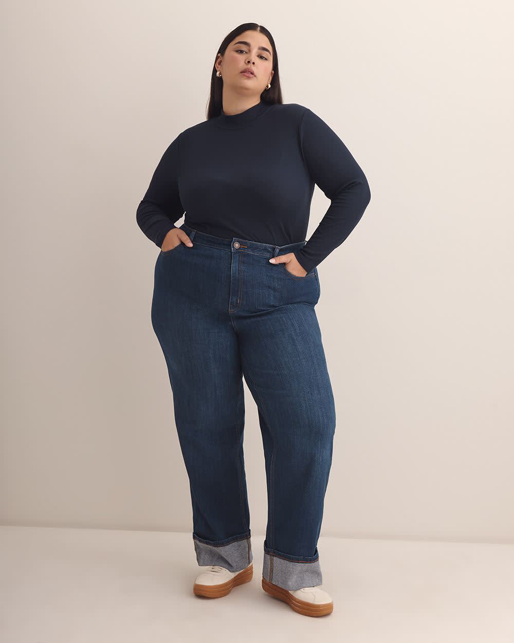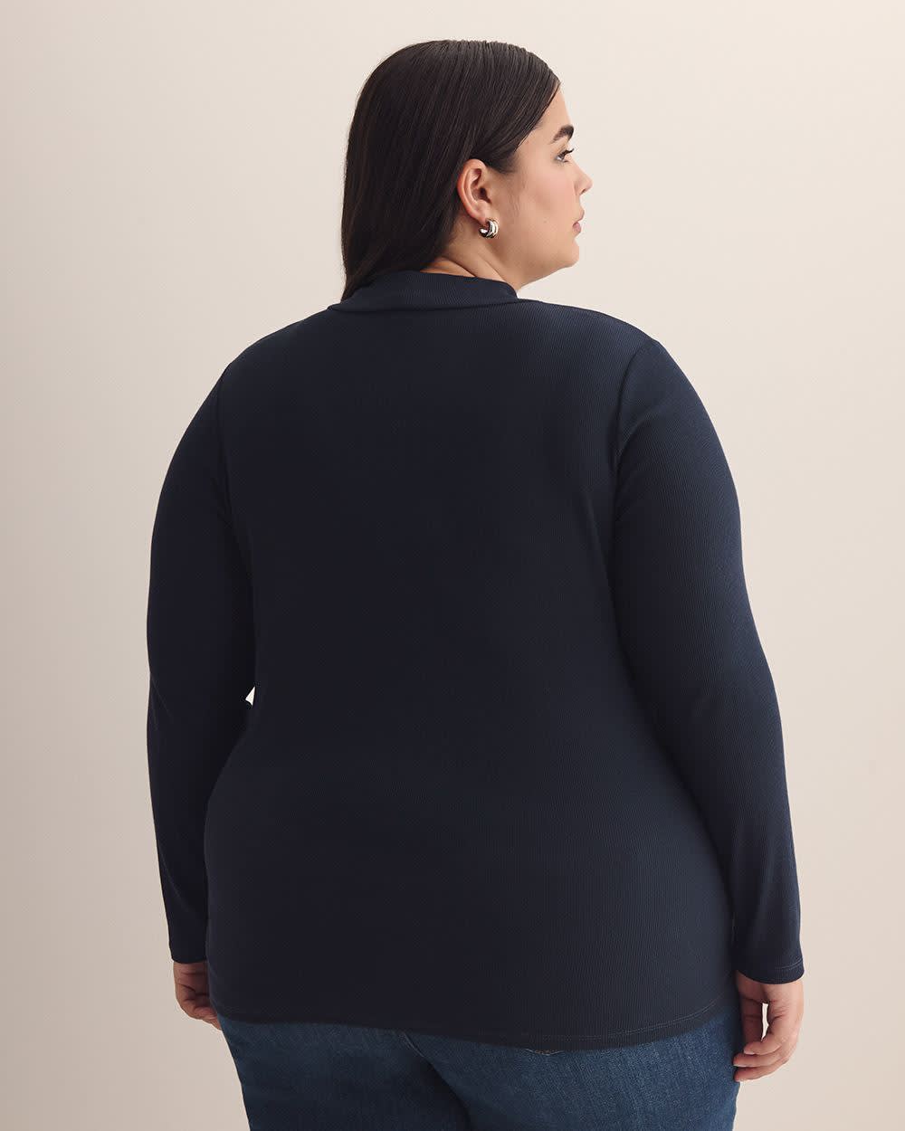 For a modern yet classic top, try this plus-size long-sleeve fitted top! Boasting a trendy ribbed knit finish for a touch of texture and an elegant mock neckline, this modern-looking tee will provide you with a cozy everyday style. Perfect for layering with a blazer or cardigan.