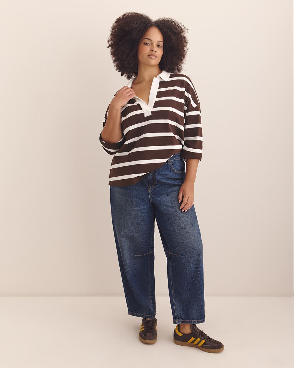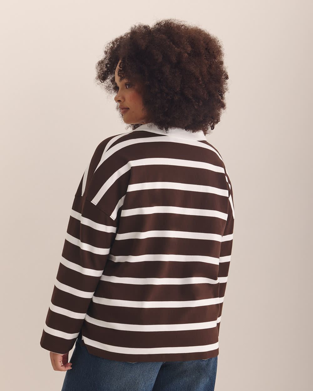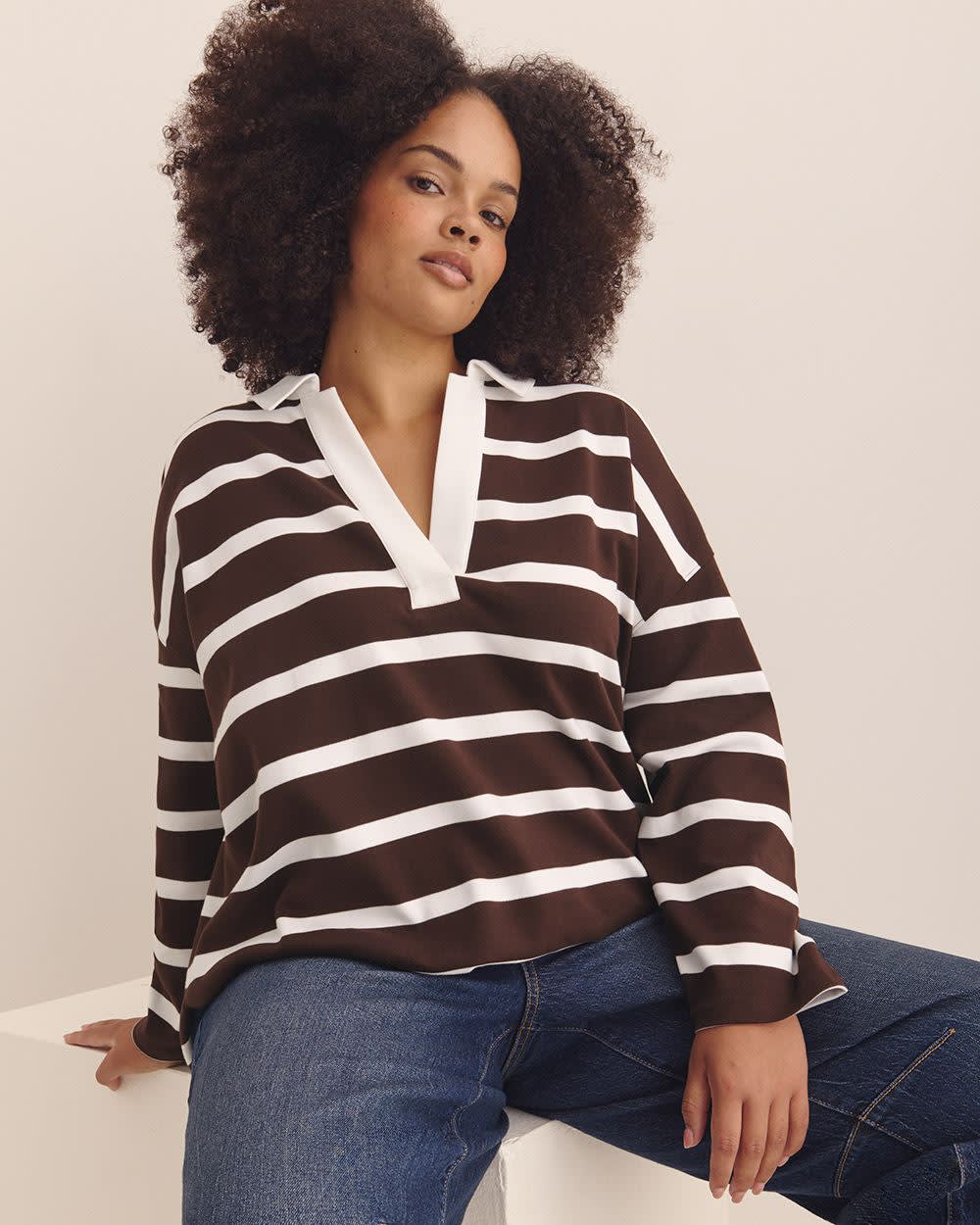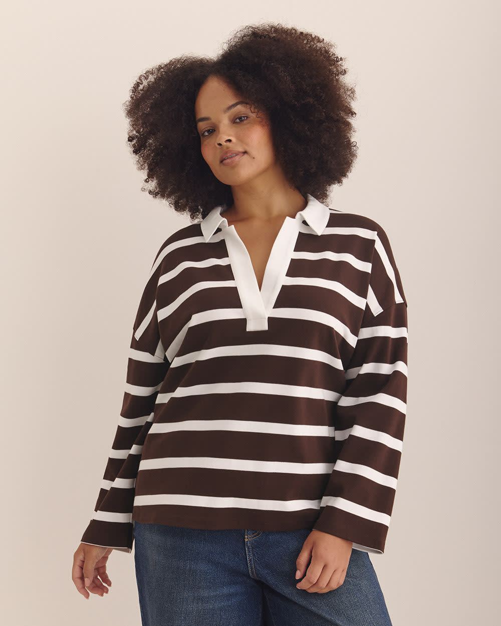 What about a casual striped polo sweatshirt? This plus-size shirt featuring a classic V-neck polo collar, relaxed long sleeves with dropped shoulders and trendy rugby stripes is an absolute must-have in your seasonal wardrobe.