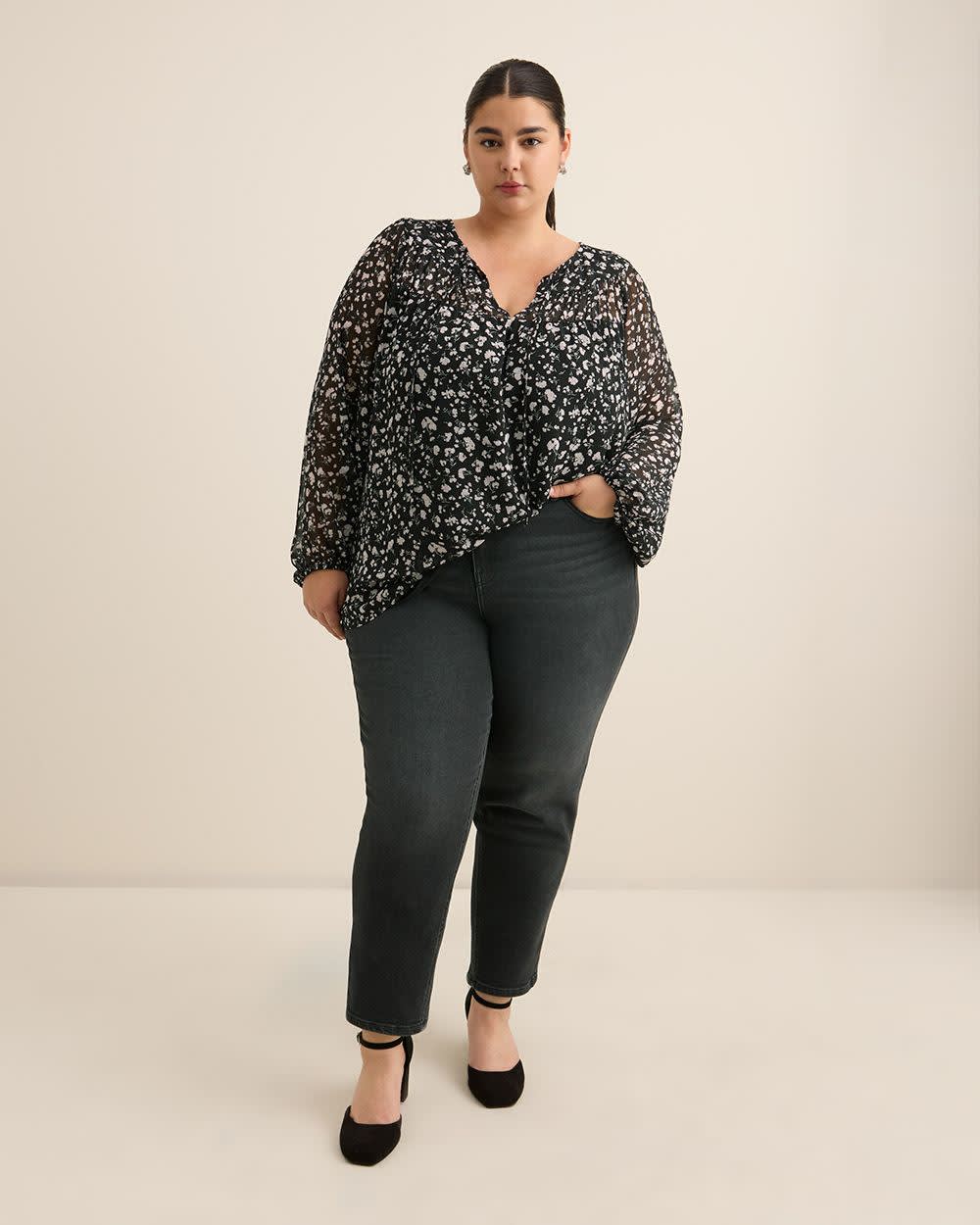 Float through your day in this plus-size lightweight shirred swing blouse. With its balloon sleeves, tied neckline, and flowy fit, it's an easy blend of comfort and charm.
