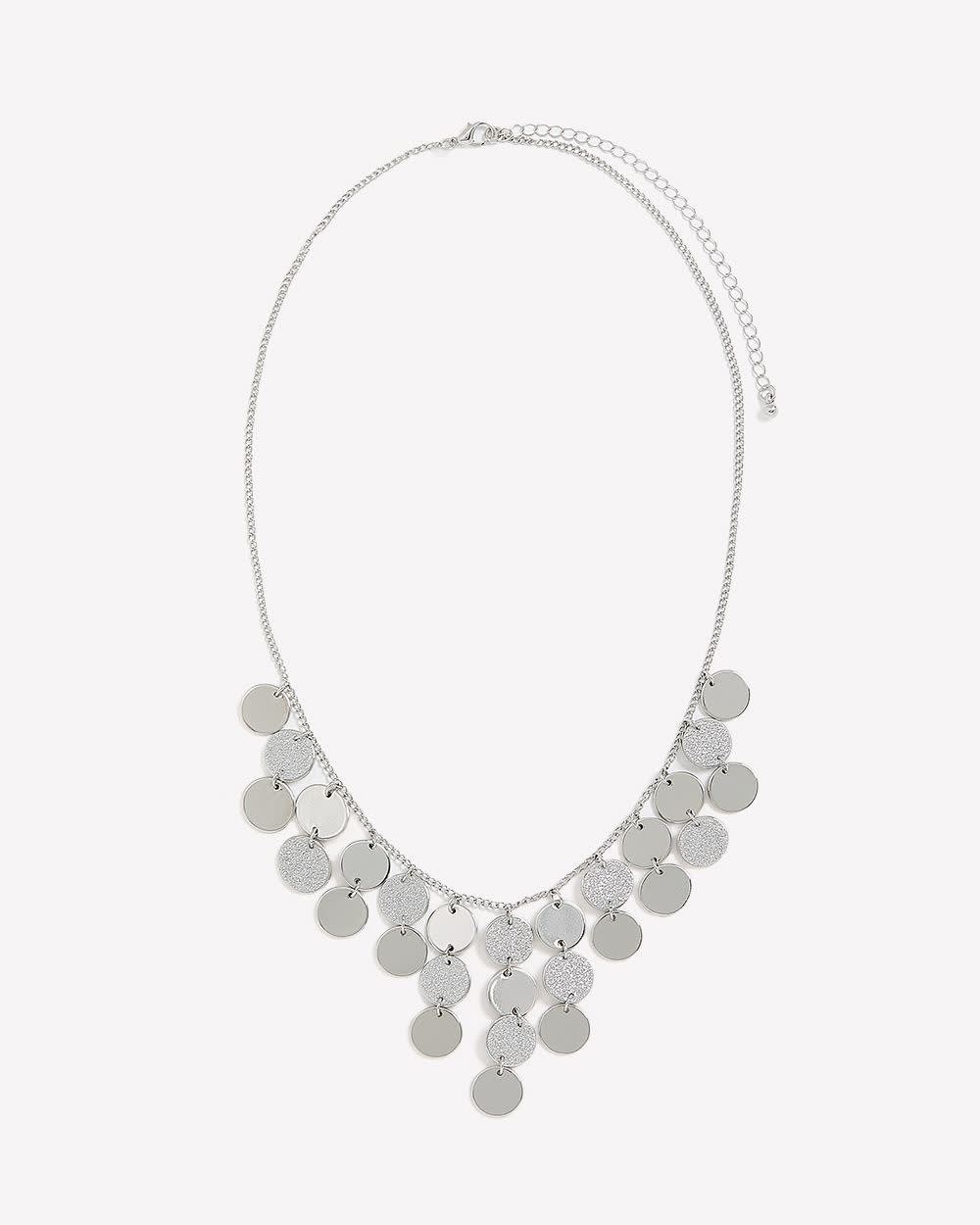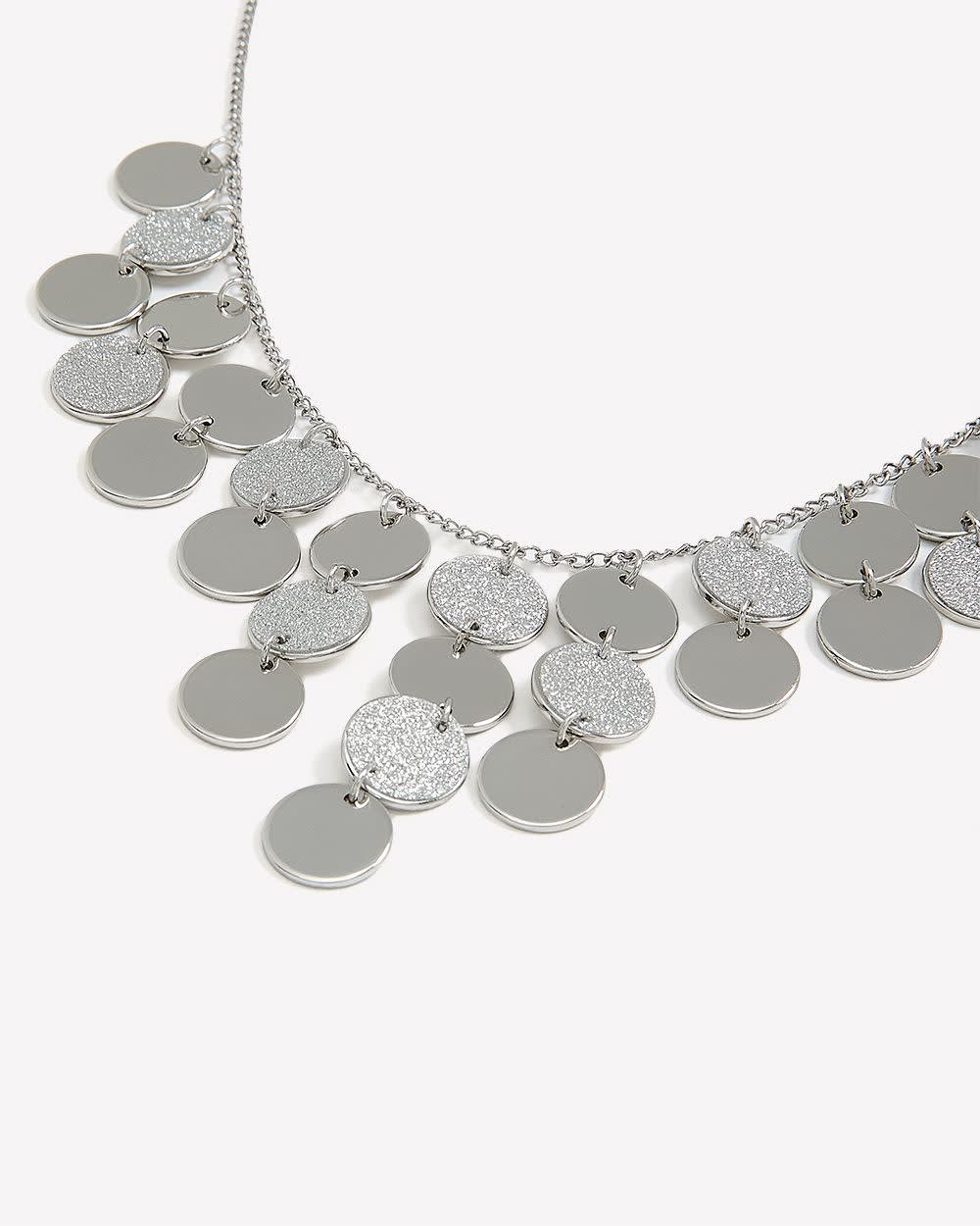 Add a little spark to your look with this short statement necklace fashioned with drop discs made of paper glitter.