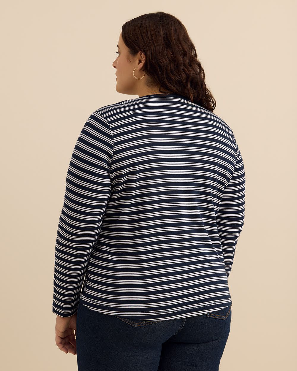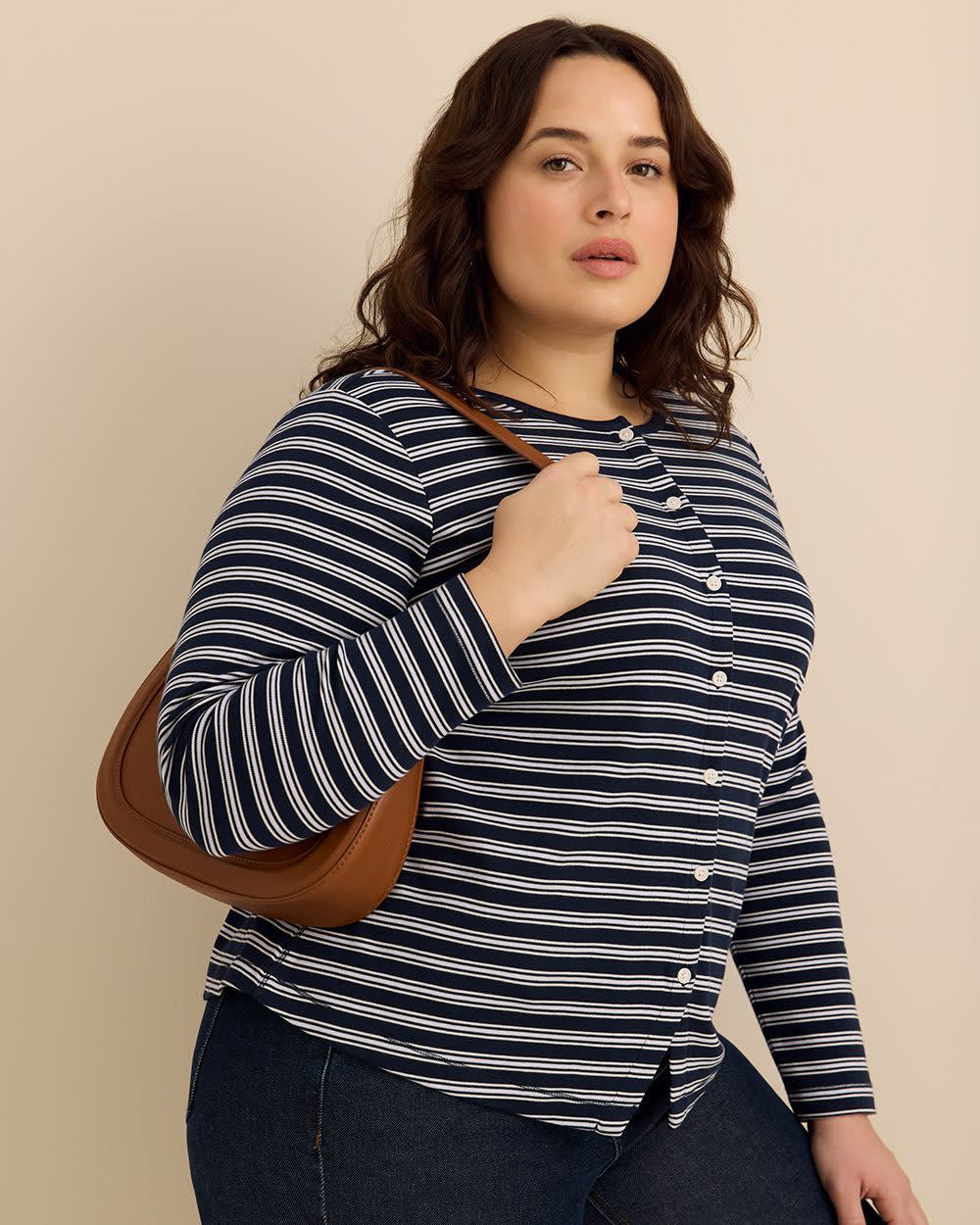 A timeless layer with a playful twist. This plus-size soft knit top drapes beautifully with its flyaway hem, offering just the right touch of movement and ease. Effortless to button up, easy to love every day.