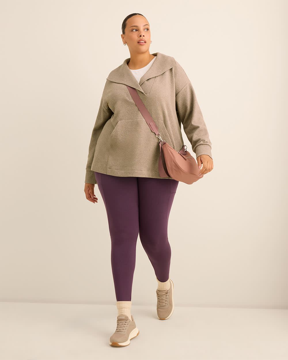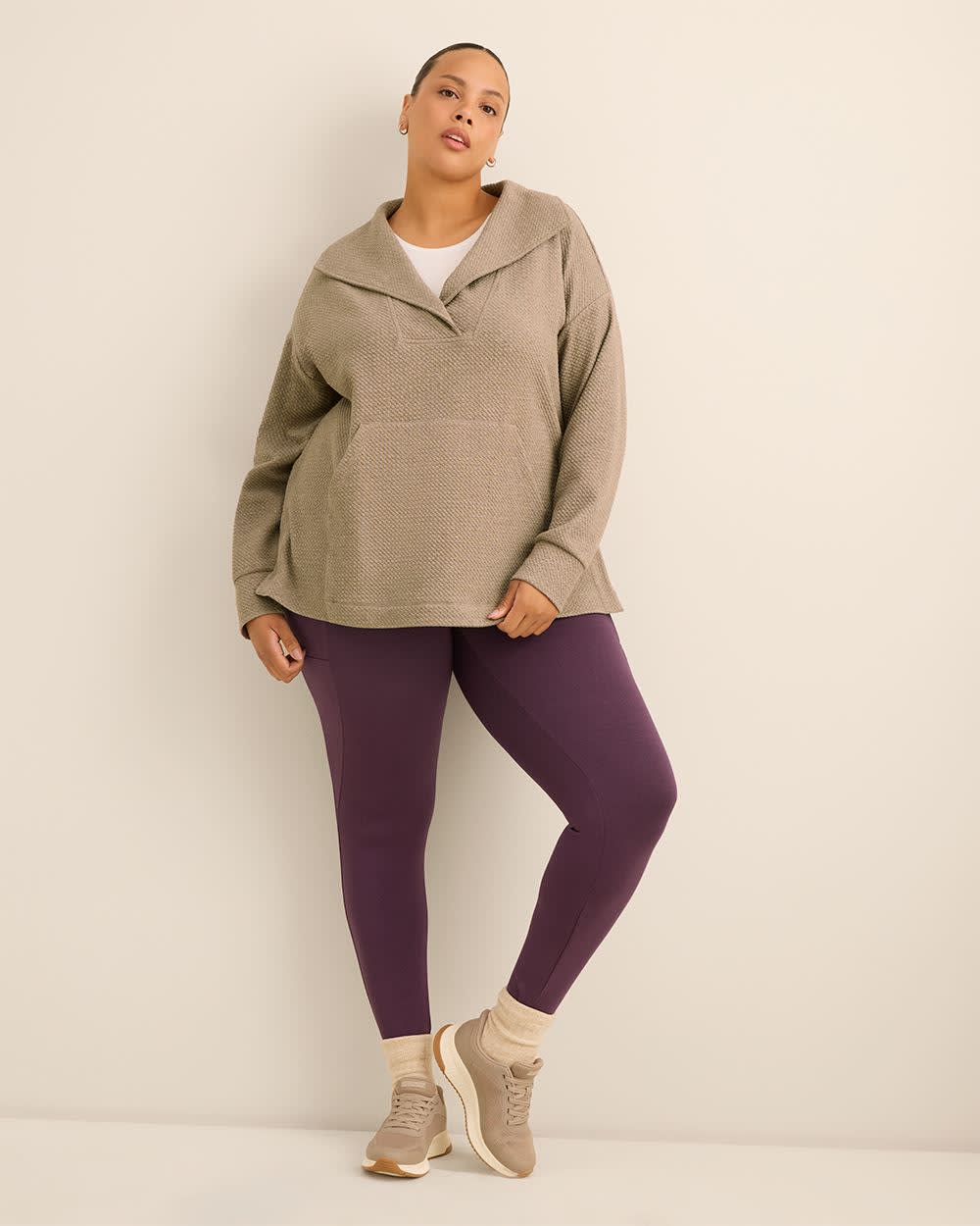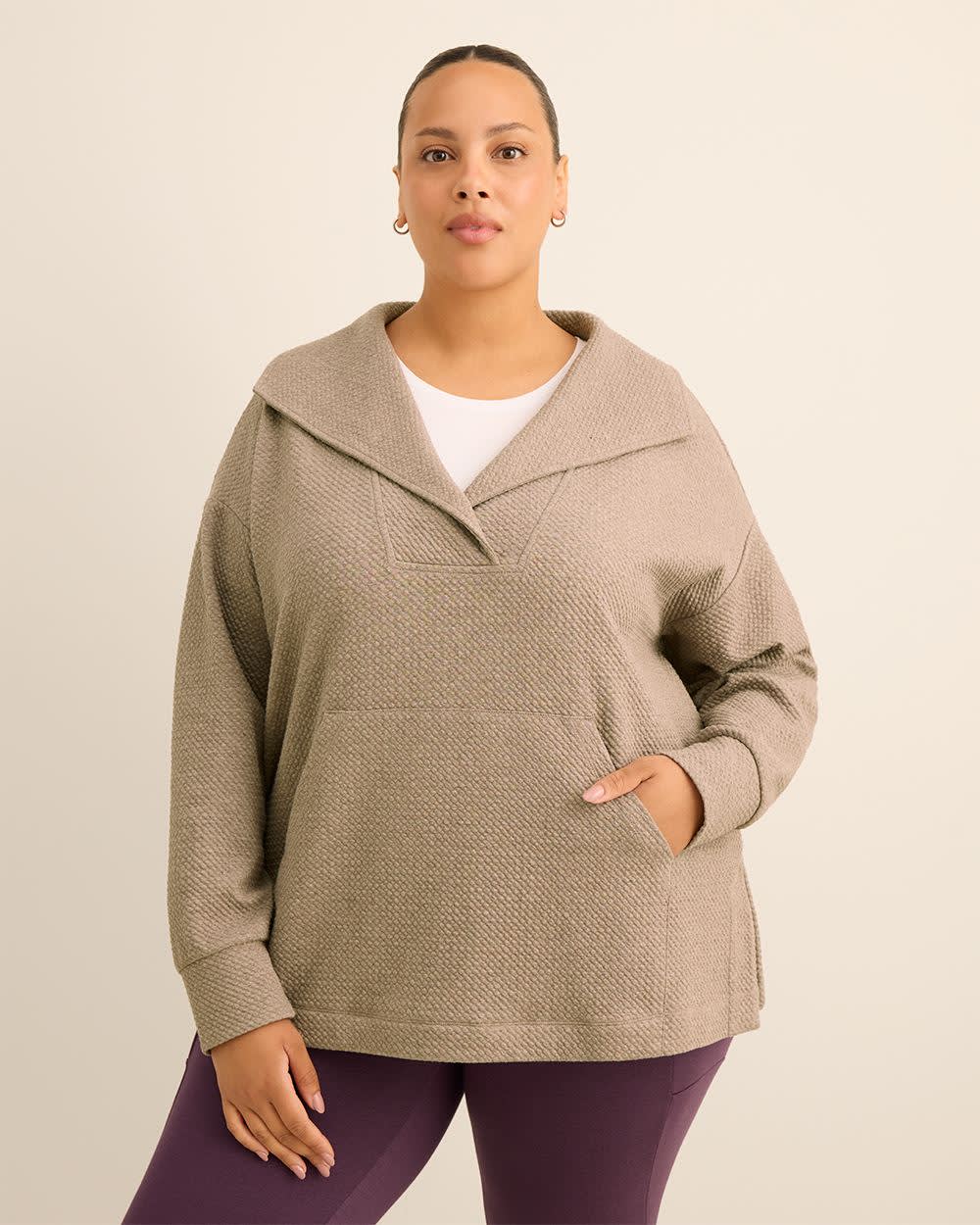 Stay laid-back and chic in this plus-size textured pullover with a wide collar. Finished with a kangaroo pocket and side slits, it's the perfect mix of comfort and casual polish.