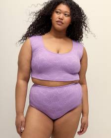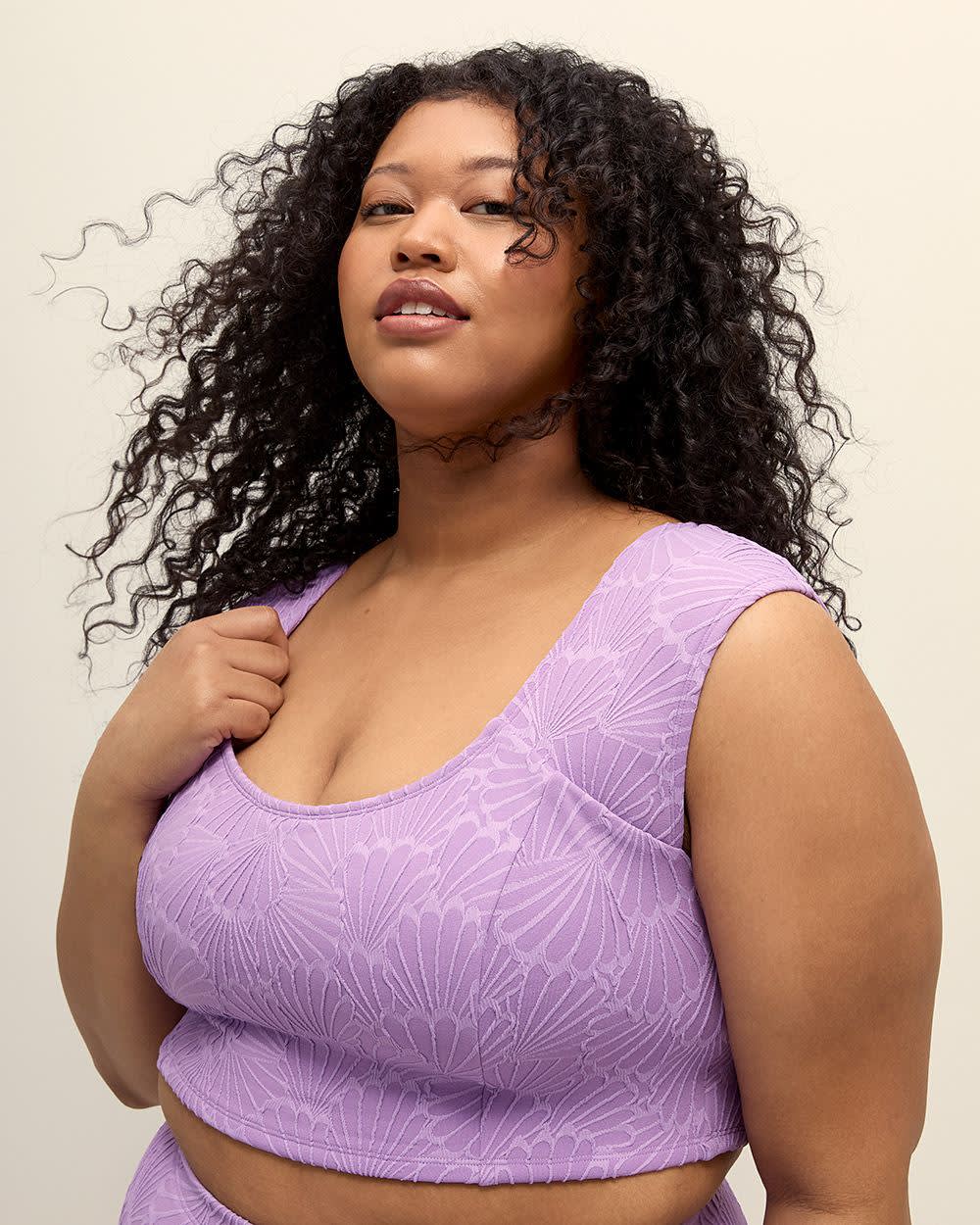 Fresh and sophisticated. This plus-size bikini swim top is the perfect addition to your swimwear collection with its stylish seashell textured finish in a stunning lavender colour. While the longline design offers extra coverage and support, the completely unique lace-up back gives your beach look the perfect trendy vibe.