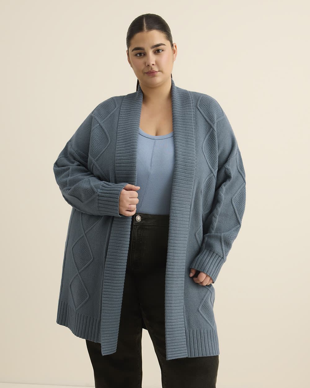 Wrap yourself in warmth with this plus-size tunic-length sweater coat featuring cable stitch details. Soft and relaxed with an open front and folded collar, it's the perfect blend of comfort and sophistication.