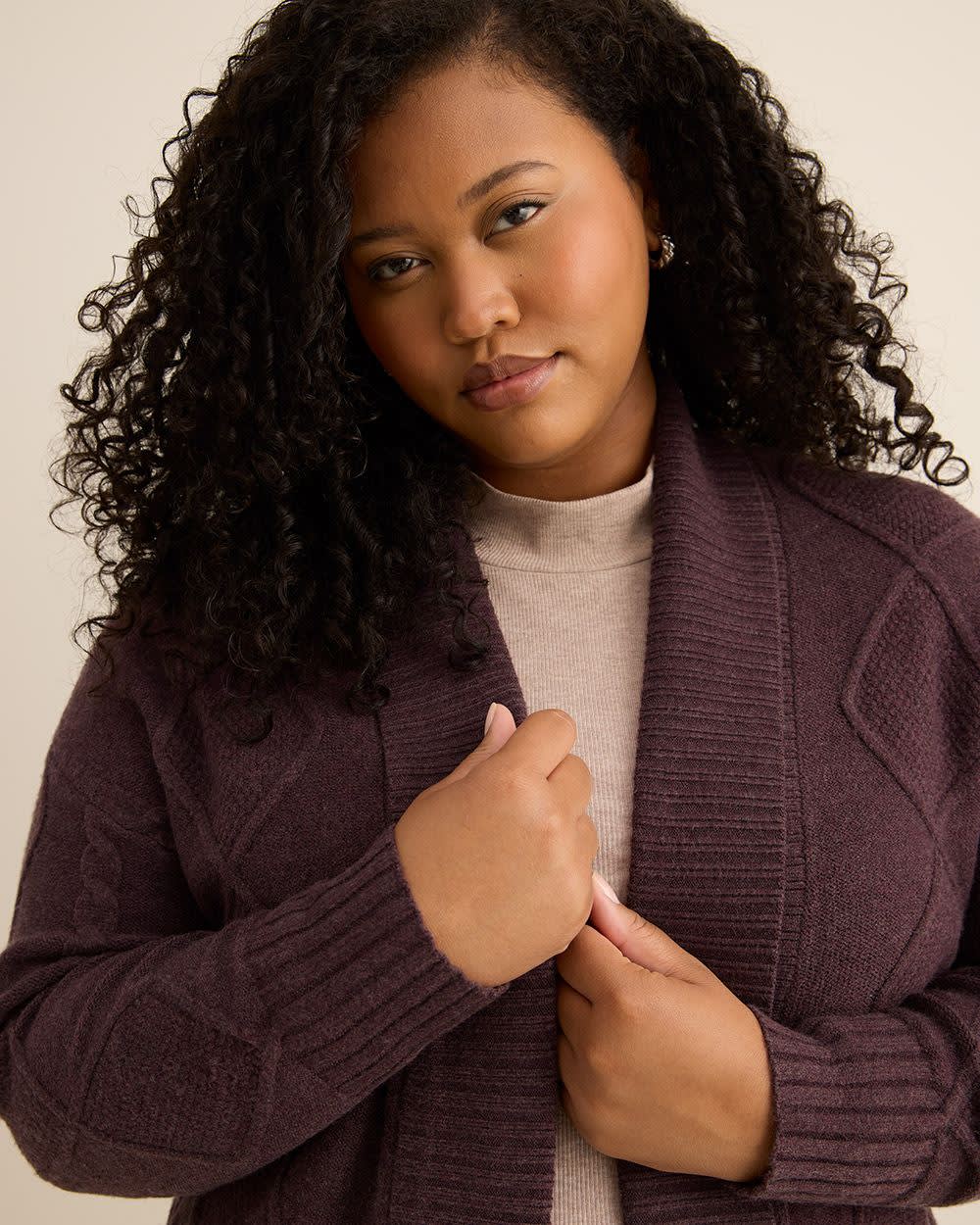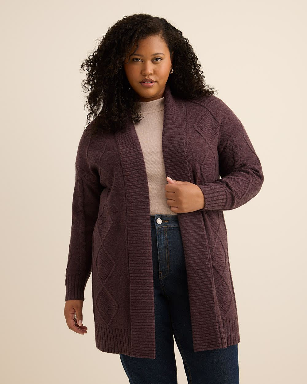 Wrap yourself in warmth with this plus-size tunic-length sweater coat featuring cable stitch details. Soft and relaxed with an open front and folded collar, it's the perfect blend of comfort and sophistication.