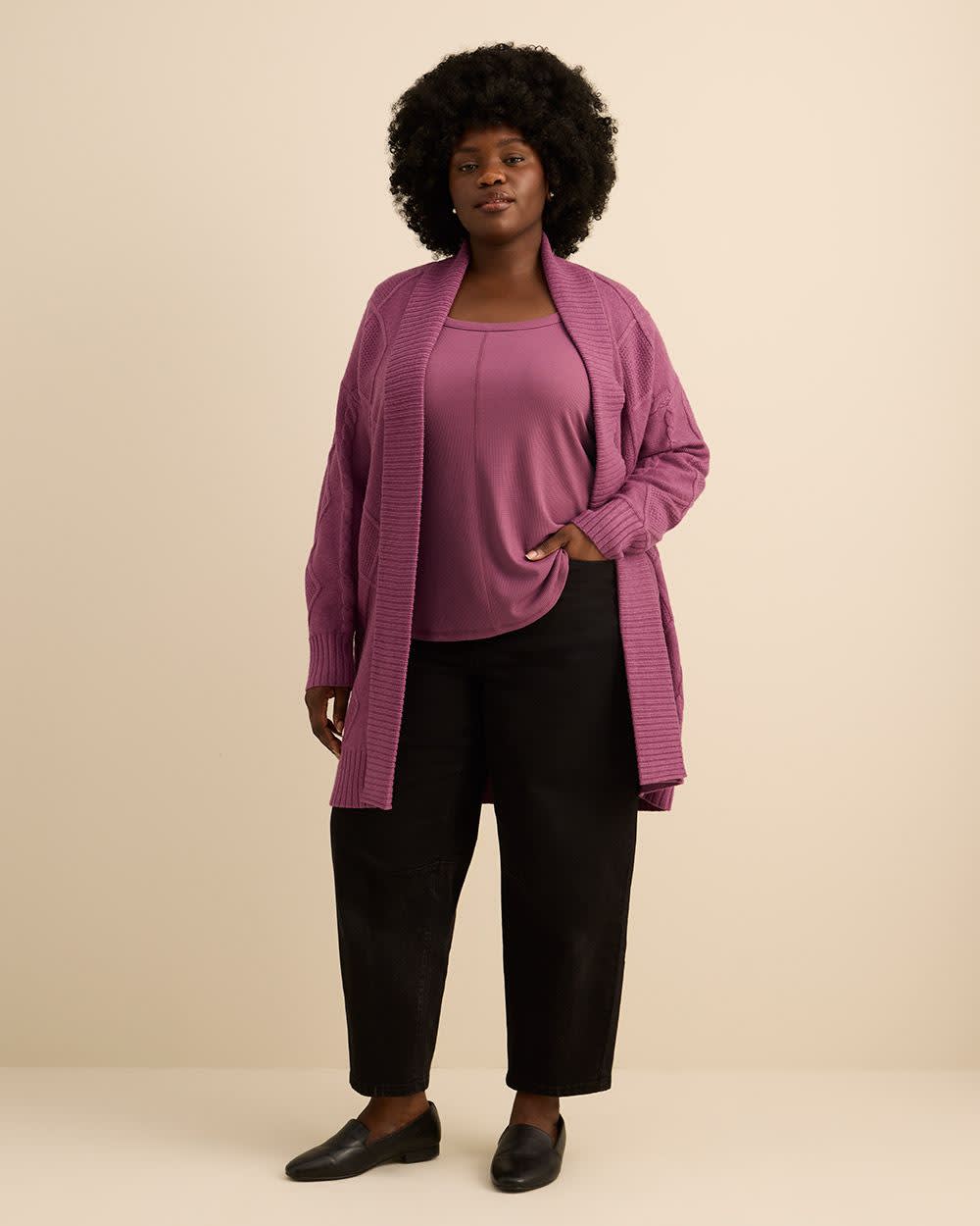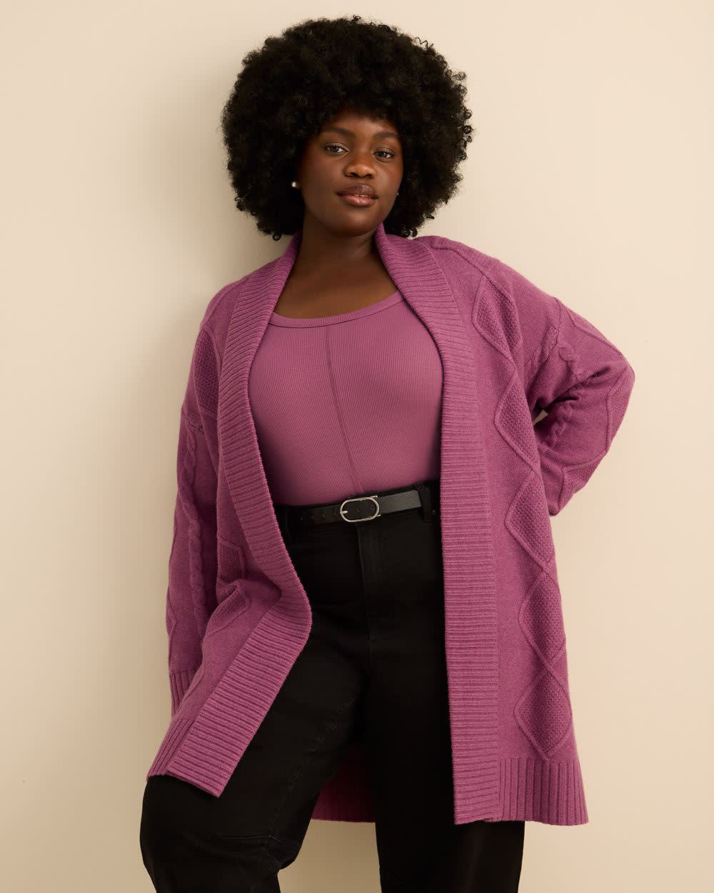 Wrap yourself in warmth with this plus-size tunic-length sweater coat featuring cable stitch details. Soft and relaxed with an open front and folded collar, it's the perfect blend of comfort and sophistication.
