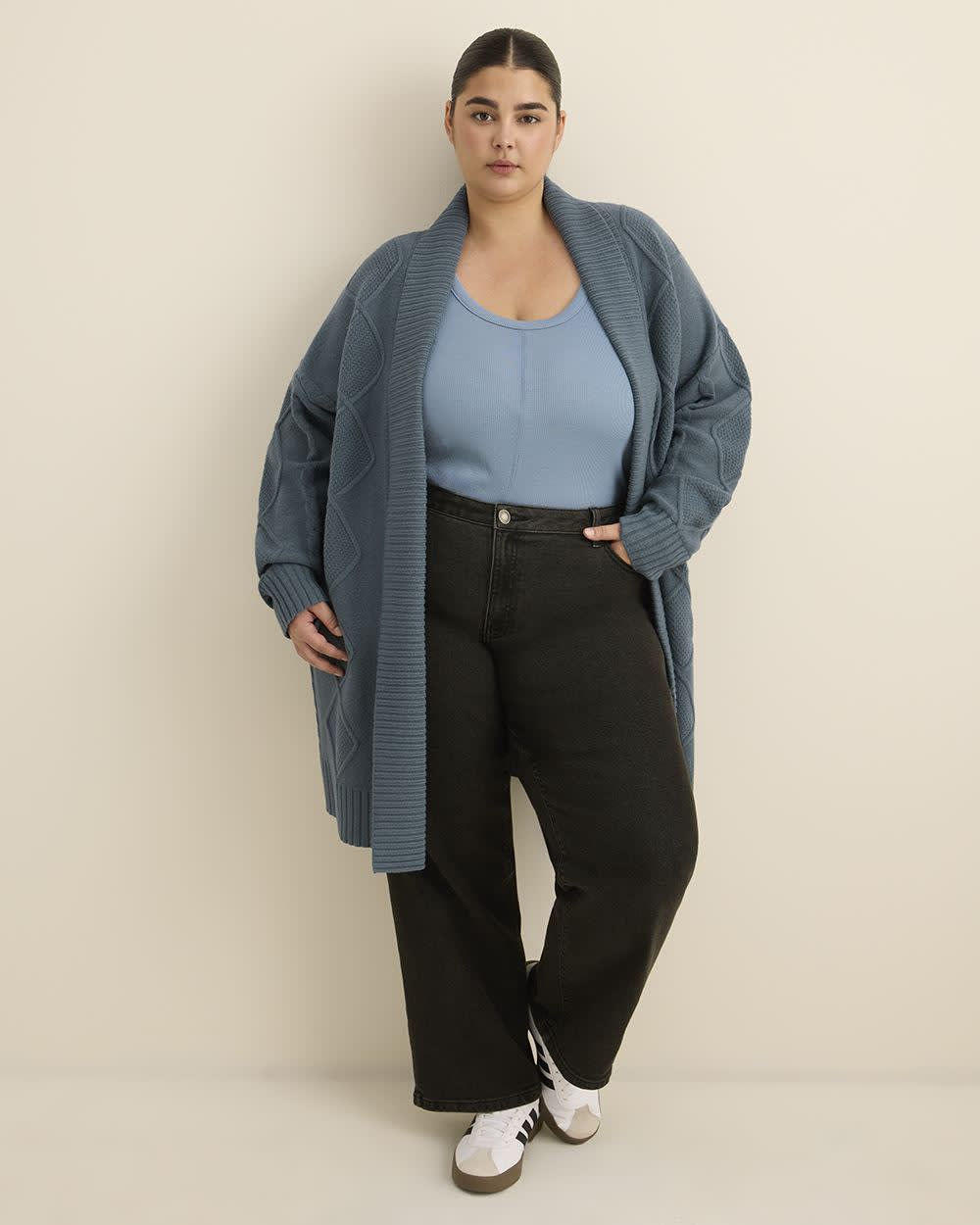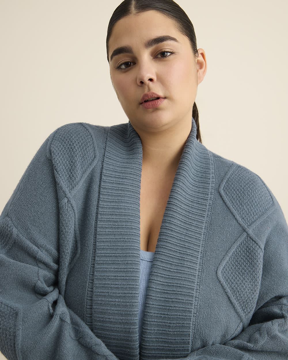 Wrap yourself in warmth with this plus-size tunic-length sweater coat featuring cable stitch details. Soft and relaxed with an open front and folded collar, it's the perfect blend of comfort and sophistication.