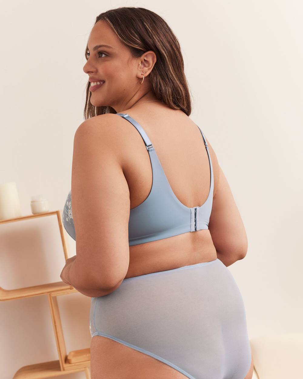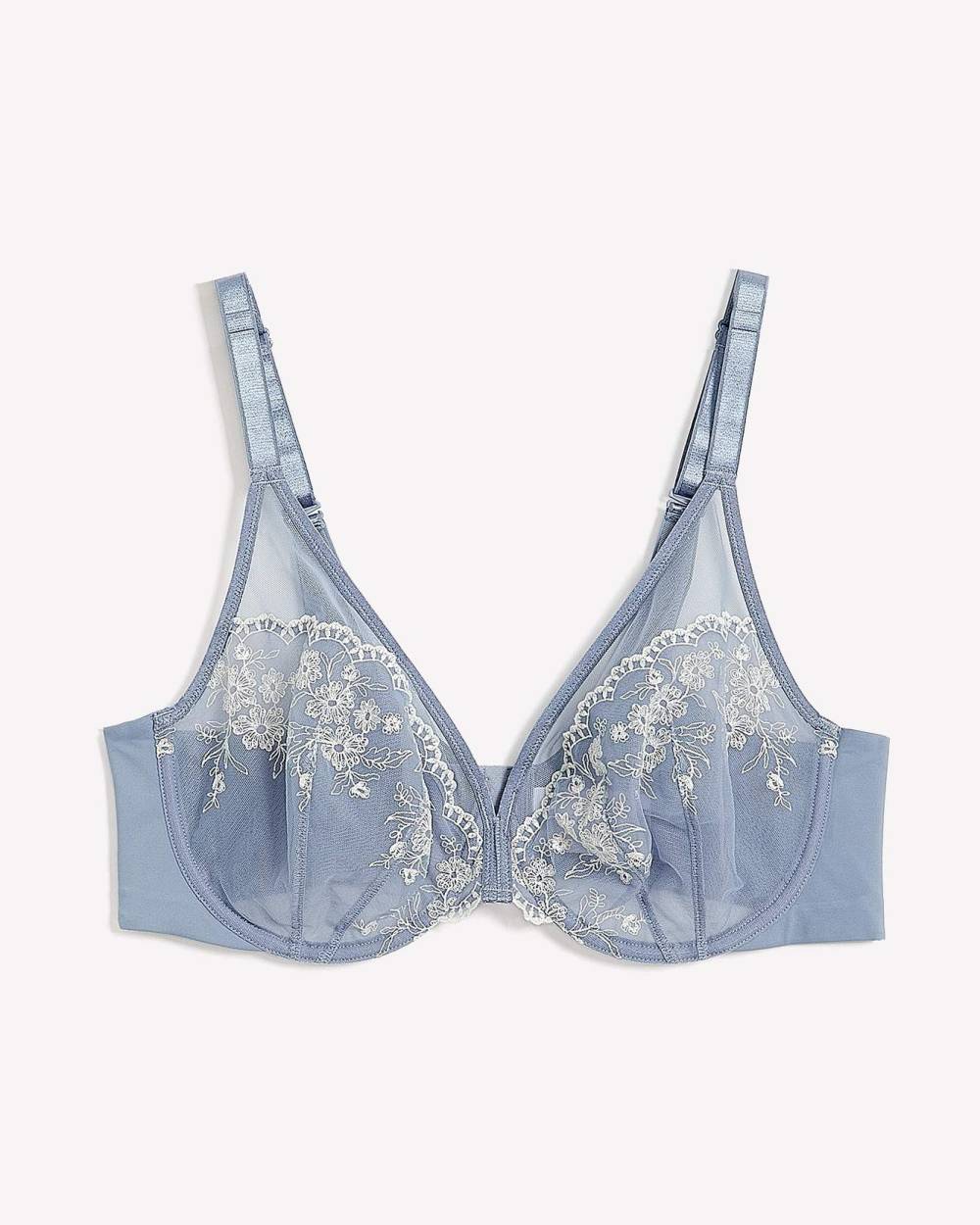 Opt for sultry style, optimal support and ultimate comfort with this elegant plus-size plunge bra adorned with embroidered mesh cups. Featuring adjustable straps, unlined cups and a clean back wing finish, this bra will make you feel perfectly beautiful.