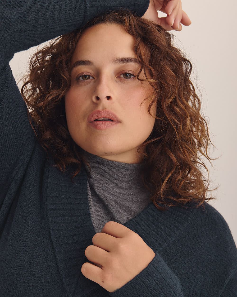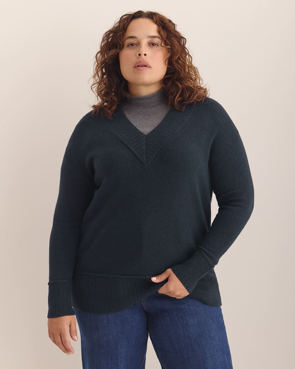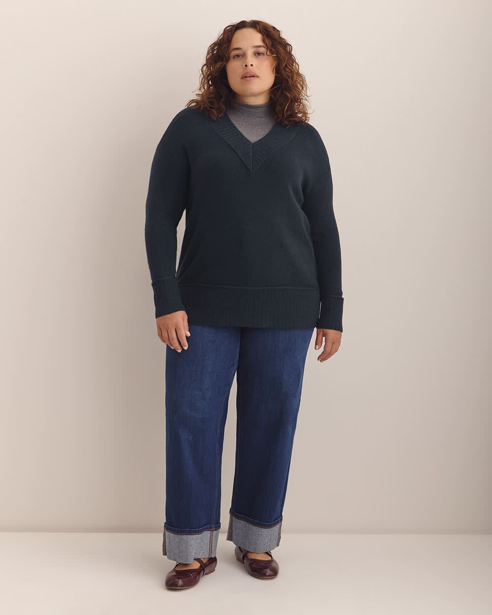 Cozy up in this effortlessly chic plus-size V-neck tunic sweater. Its straight relaxed cut, dropped shoulders, and soft knit make it the perfect piece for snuggling in comfort and style.