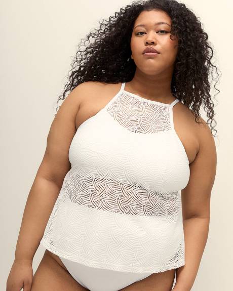 Super feminine and unique, this plus-size tankini top is perfect from every angle. Made of white textured lace with a halter neckline and inner bandeau, this swim top was designed to make you feel utterly beautiful this summer.