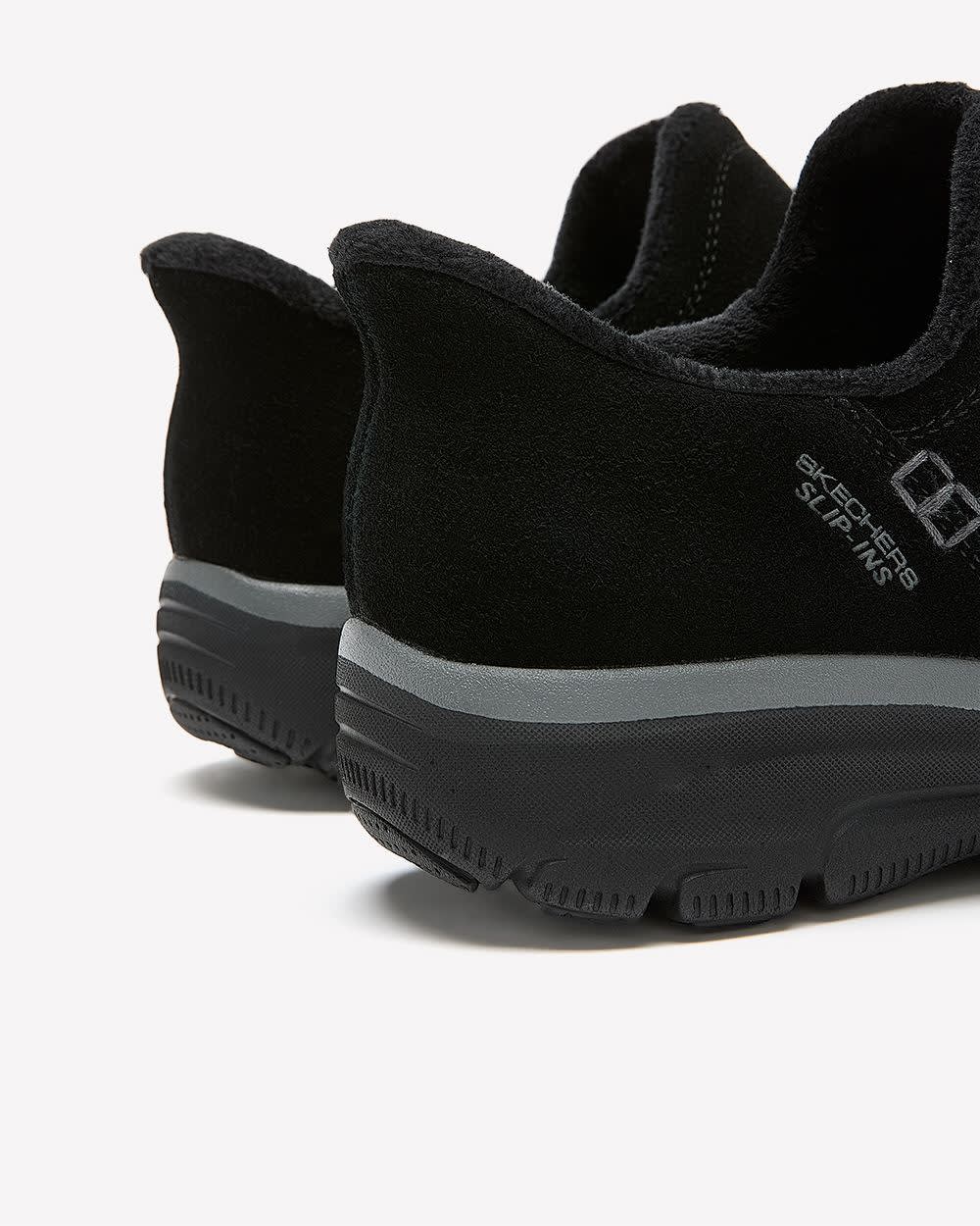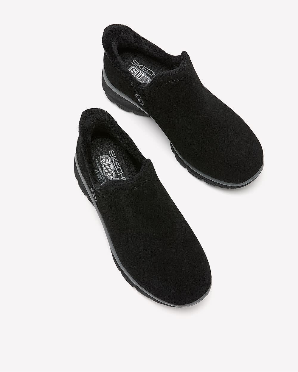 ONLINE EXCLUSIVE. Stay warm and cozy with these hands-free slip-on booties from Skechers. Designed with a cushioned heel, this roomy relaxed bootie features a treated suede upper to repel water, soft chenille lining for a warm footwear, and a cushioned memory foam insole for all-season comfort.