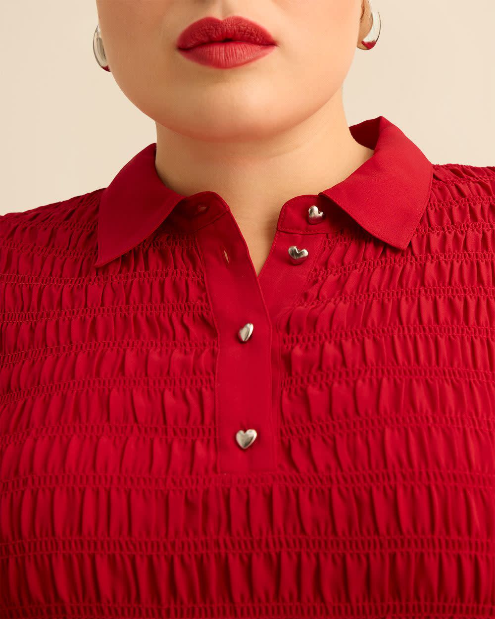 Élégante et fluide, cette blouse taille plus en crêpe soyeux séduit par son design à smocks et ses manches papillon. Son col chemise et sa coupe évasée mettent la silhouette en valeur avec un style soigné et raffiné.