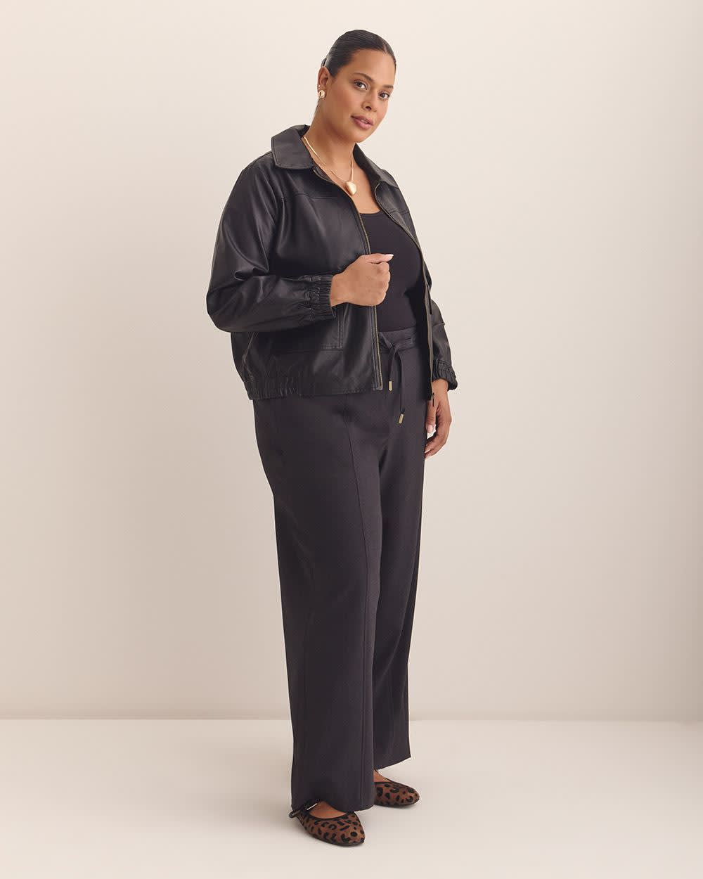 Ajoutez du style décontracté à votre garde-robe cette saison! Ce blouson aviateur écourté taille plus en faux cuir est un par-dessus parfait à porter avec n'importe quel pantalon, ou même une robe, pour un look chic décontracté.