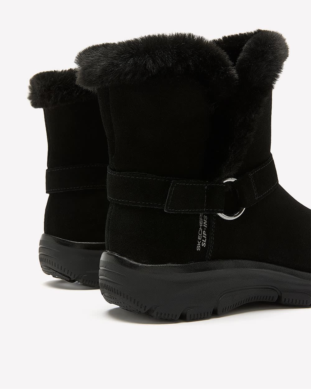 Cette saison, adoptez un confort douillet incomparable avec cette botte d'hiver courte de Skechers. Conçue pour le confort de vos pieds, cette botte pour pied large comprend une empeigne en suède traité , une doublure et une garniture en fourrure synthétique, une sangle avec boucle autour de la cheville et une semelle intérieure coussinée.