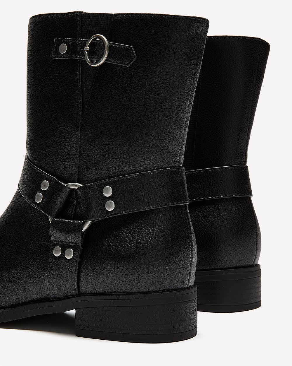 Affirmez votre style avec ces bottillons de moto noirs en faux cuir. Leur bride décorative à anneau et clous ajoute du caractère, tandis que la coupe pour pied très large assure un confort optimal.