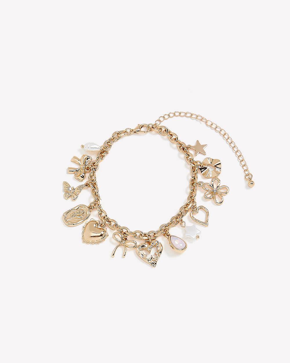 Un joli bracelet doré à maillons doté de jolies breloques, voilà l'accessoire parfait pour ajouter une discrète touche d'élégance à votre poignet.
