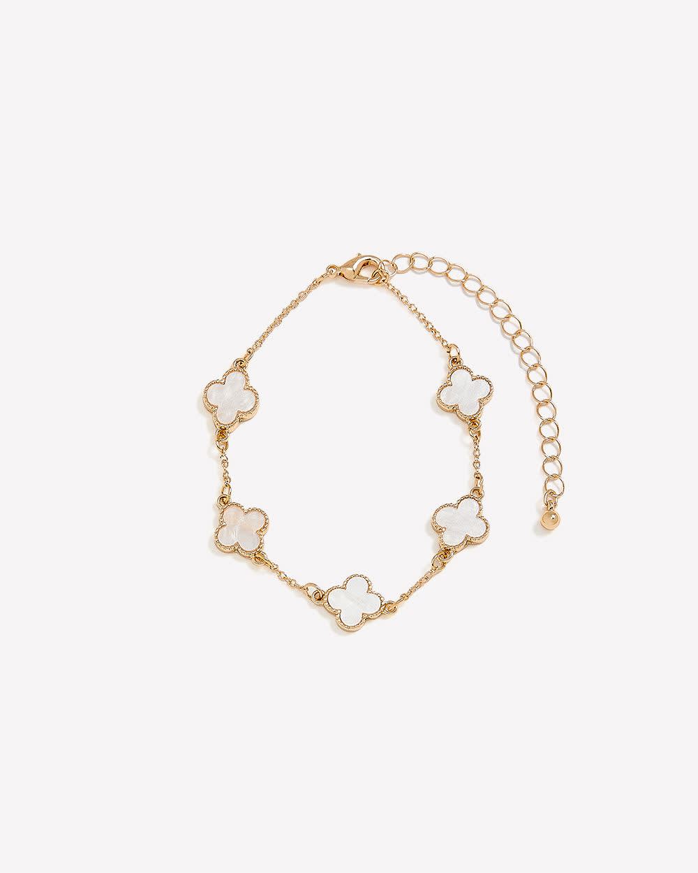 Délicat et raffiné, ce bracelet doré est orné de petits pendentifs fleuris blancs. Un accessoire subtile qui apporte élégance et une touche de fantaisie à toutes vos tenues.