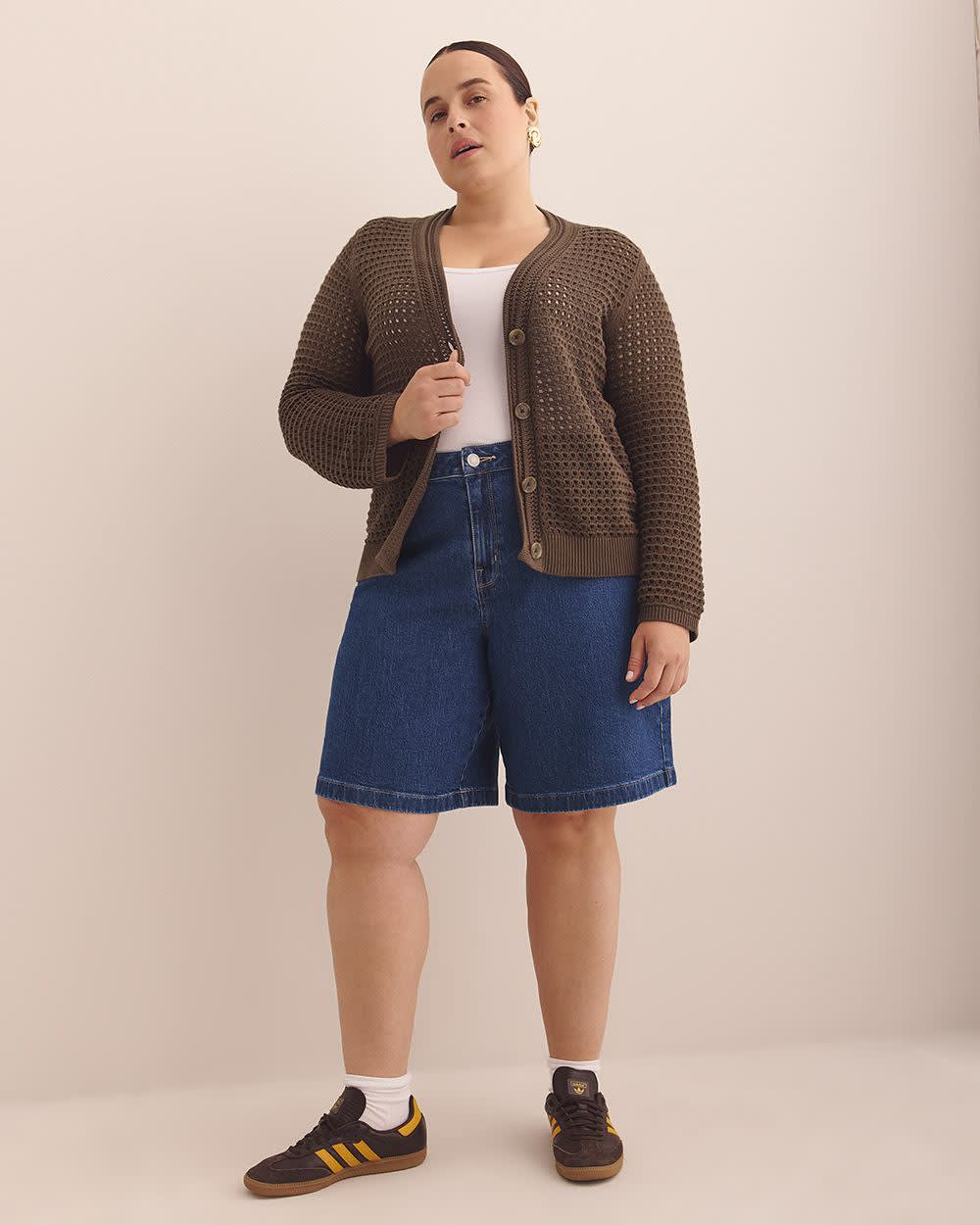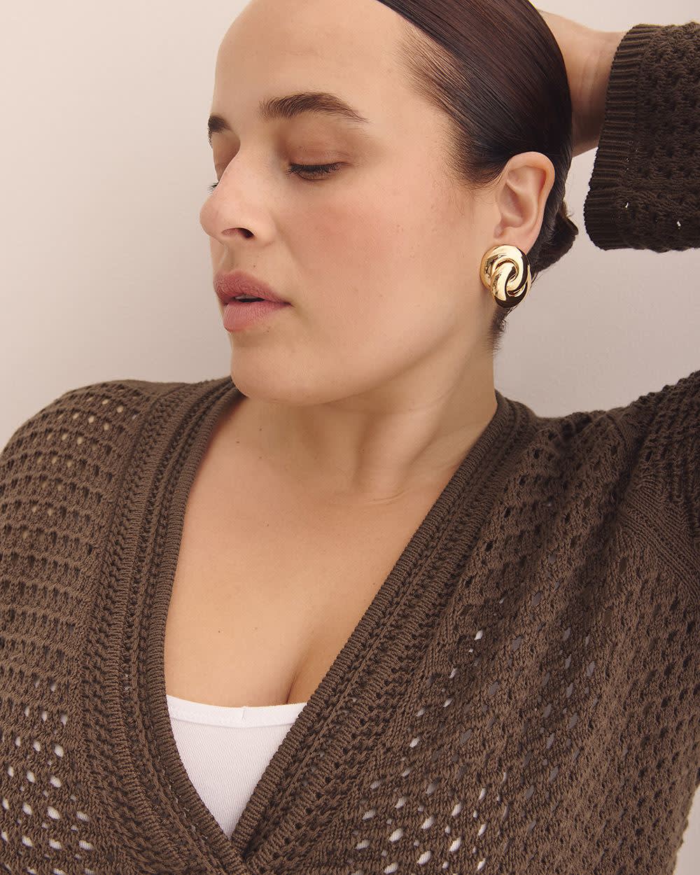 Léger, ajouré et plein de charme, ce cardigan taille plus en crochet est un indispensable à superposer tout au long de la saison. Son design en maille crochetée s'agence à un décolleté en V classique et une fermeture boutonnée, tandis que ses manches longues et sa longueur écourtée offrent une allure féminine et décontractée.