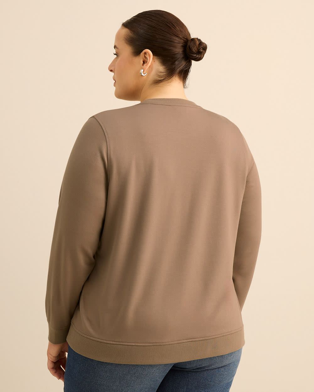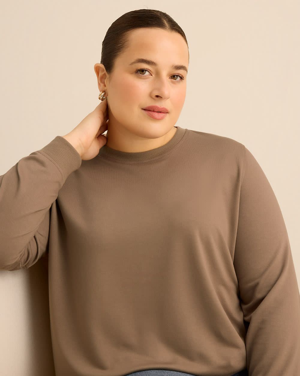 Êtes-vous prête à vous sentir dorlotée? Doté de détails classiques comme un col rond et des épaules légèrement tombantes, ce sweatshirt taille plus en molleton est parfait pour agencer à des leggings lors de vos journées décontractées pour vous sentir confortable sans compromettre votre style.