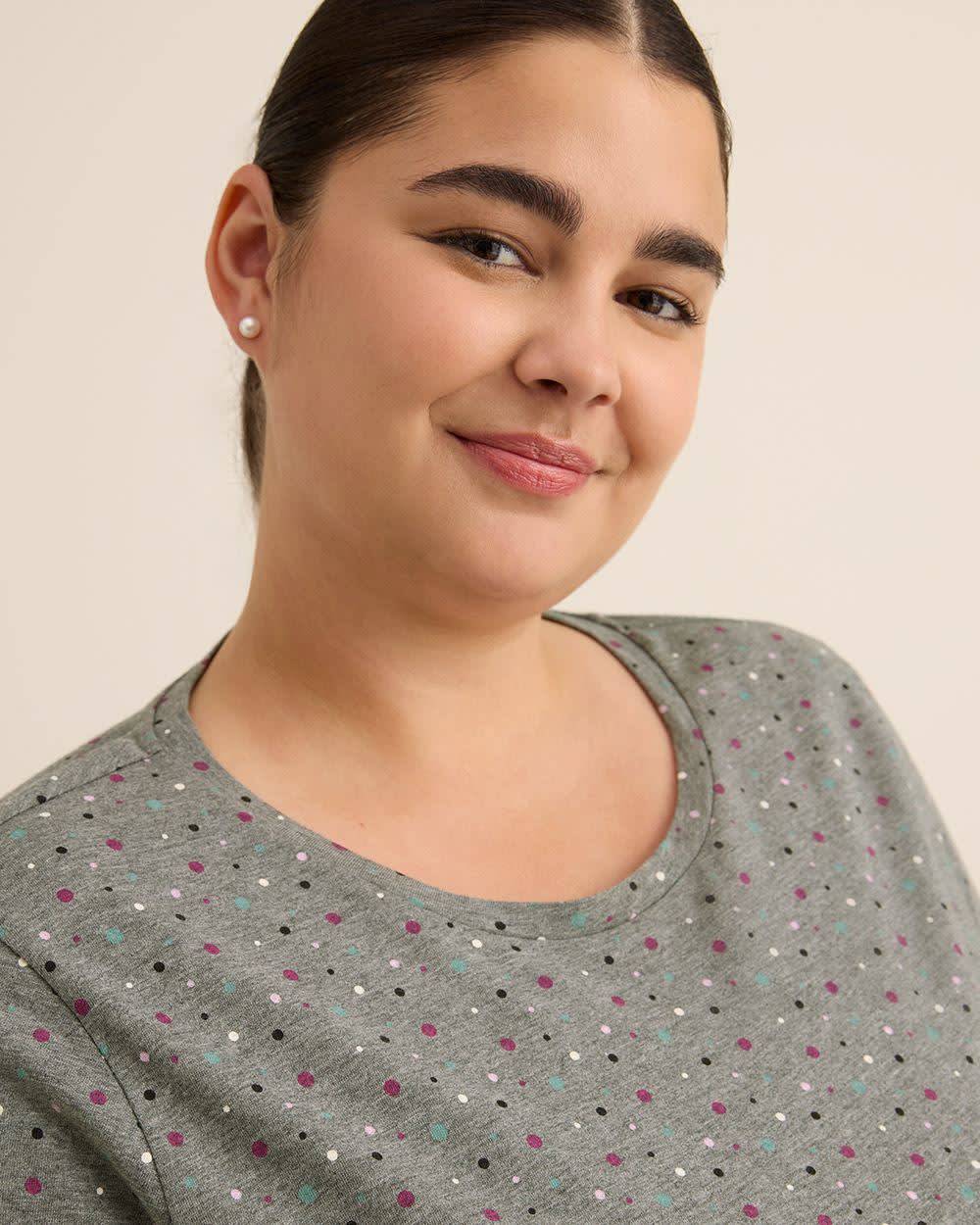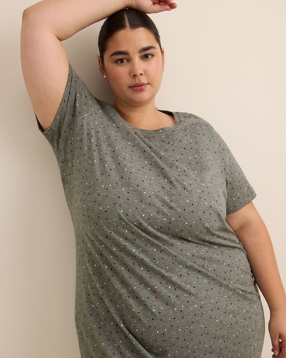 Faites de beaux rêves avec cette chemise de nuit taille plus faite de jersey extensible chiné. Conçue avec un motif à pois tendance, un col Henley arrondi orné de trois boutons fonctionnels, des détails en ruban picot brodé, des manches courtes et des fentes de chaque côté de l'ourlet, ce pyjama vous assure une nuit toute en confort et en style.