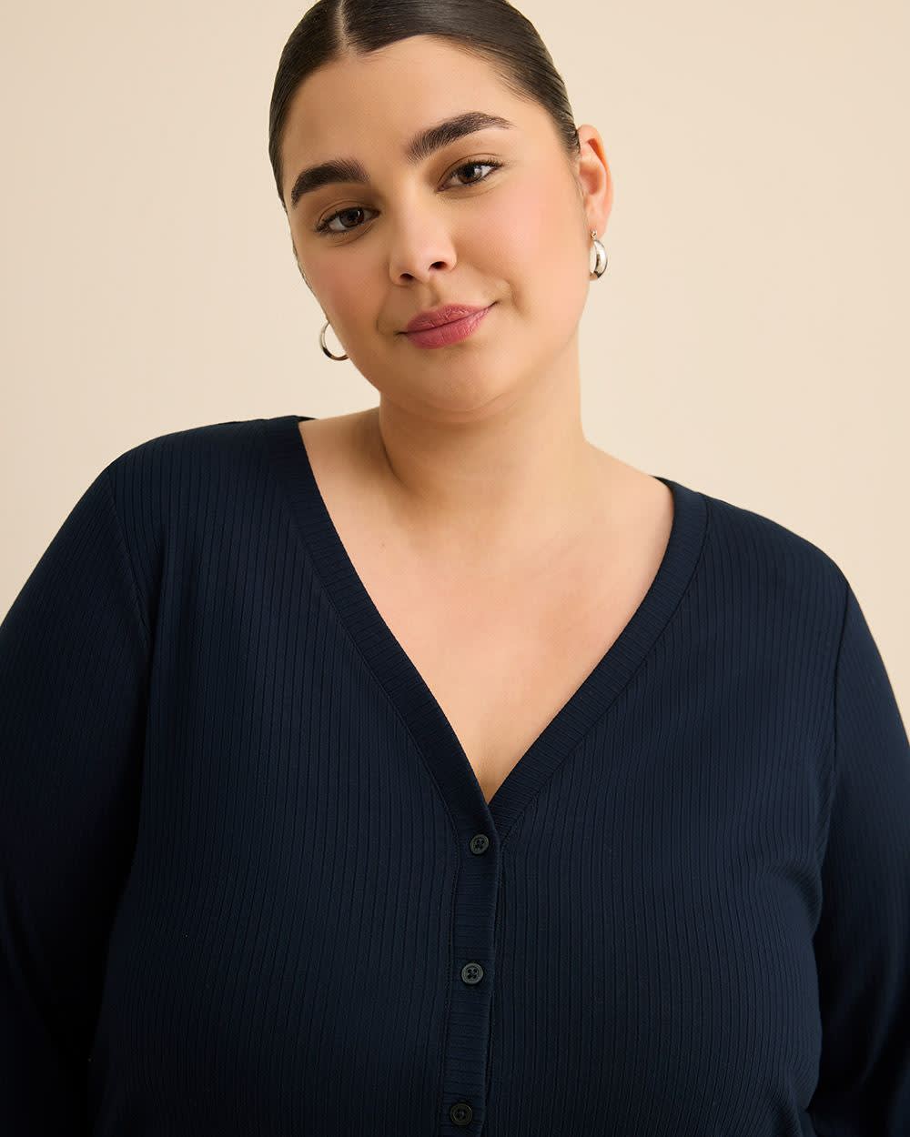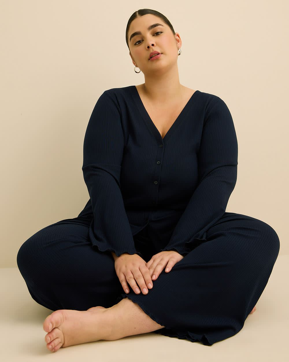 Que vous soyez un peu frileuse la nuit ou que vous cherchiez un vêtement à porter par-dessus votre pyjama à l'heure du petit-déjeuner, ce cardigan taille plus est un choix tout indiqué. Fait dans un tissu de tricot côtelé doux, ses poignets et son ourlet festonnés ainsi que ses manches cloches et sa coupe moderne en font un morceau stylé à porter la nuit ou à l'heure du brunch.